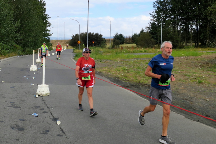 Für die Marathonis kommt noch vor der 20 km-Marke eine Links-Abbiege-Anzeige, ein halbes Dutzend Läufer bewegen sich nun wie ich ansteigend  voran, der Kurs dreht bald darauf nach Osten. Eine Labe ist in Sicht, ein paar Zuschauer applaudieren. Vor und hinter mir ist das Feld stark gelichtet, ich versuche an den Vorderen dranzubleiben, das gelingt einigermaßen.  Es  wird deutlich, dass die zweite Hälfte des Marathons auf einer Strecke verläuft, die sozusagen in menschenleere Gebiete mit angelegten Parks führt. Man sieht, dass man sich um die Natur sehr bemüht. Ohne Rasenziegel würde hier kein Gras wachsen, doch es ist im August schon braun. Bei Temperaturen am Tag um 13 Grad C kommt das Wachstum nicht so richtig in Schwung. Alles Grün in den Gärten der Wohnhäuser und Siedlungen ist von Menschenhand gepflanzt. Wo wenig Wind ist und die Sonne hinkommt, ist die emsige Gartenpflege nicht umsonst.