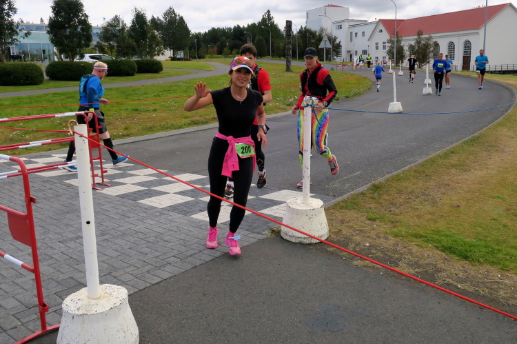 Die 40 km-Anzeige befindet sich auf der  Skolavördustigur, jene Straße, die direkt zum Leif Eriksson Denkmal vor der Hallgrimskirche hinführt. Dann folgt nochmals eine kurze Richtungsänderung, Rotkäppchen packt der Ehrgeiz, sie sichtet eine andere Läuferin und will diese noch einholen. Wir liegen alle gleichauf, doch meine kleine Chinesin will davonspringen. Genau auf der Ziellinie hole ich sie wieder ein.