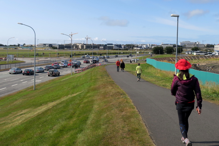 Vorbei an dem futuristischen, 2011 neu eröffneten Opern- und Konzerthaus geht es entlang der Sæbraut nach Osten, nicht am Rad- und Spazierweg, den ich gestern abgegangen bin, sondern auf der gesperrten Straße, auf der sonst die Autos fahren. Mit zwei Kanadiern komme ich ins Gespräch, Lilian und Tim Stuart wollen unter 6 Stunden finishen. Zu unserer Rechten sind erhöht die inzwischen bei der 15 km-Wende stadteinwärts Laufenden zu sehen.