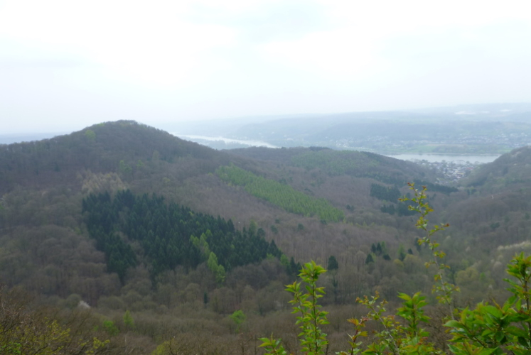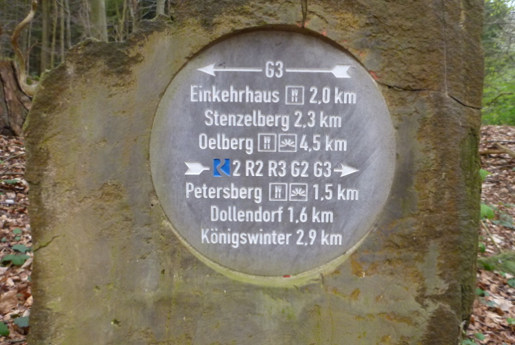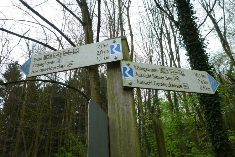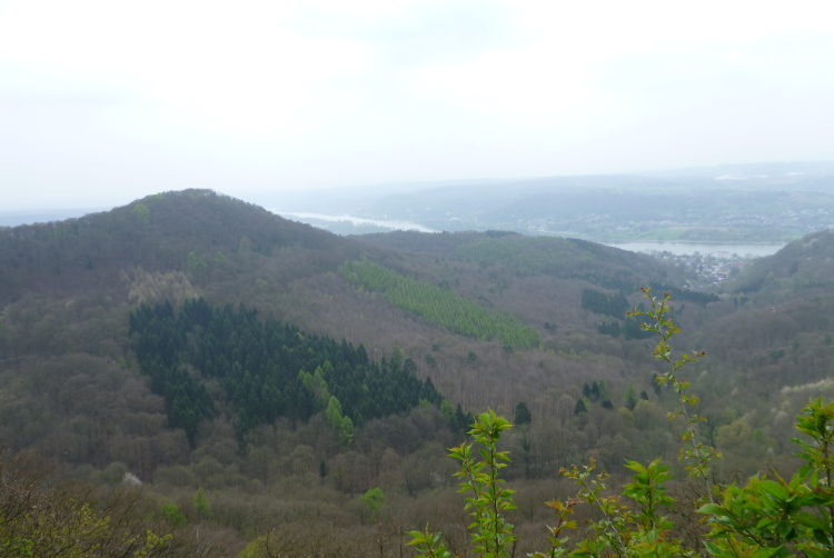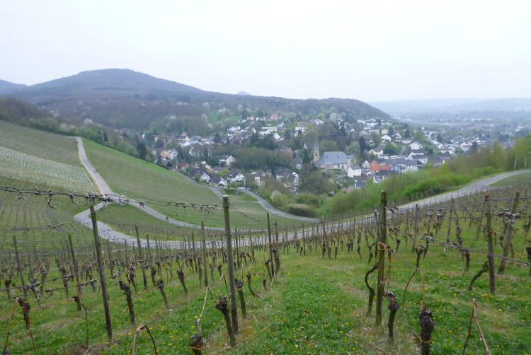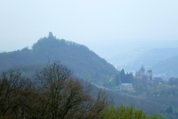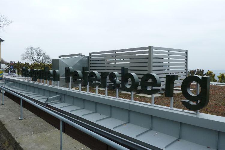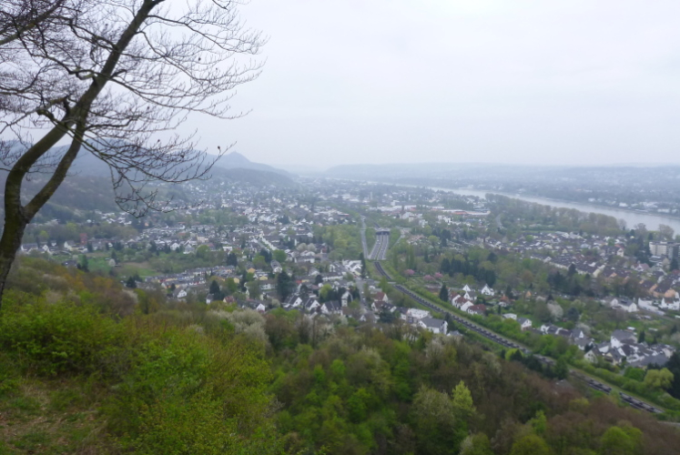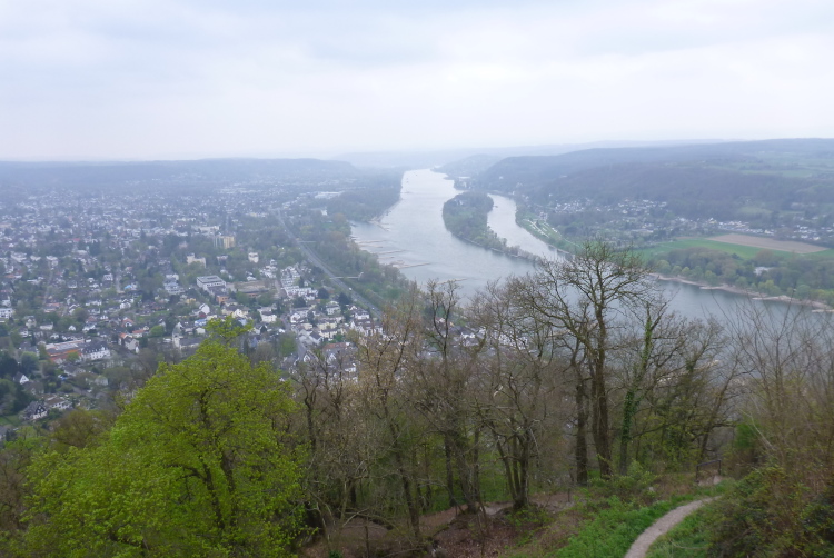 Wir entern den Wald, der sich hier noch Ennert nennt, bevor er später zum Siebengebirge wird. Oberhalb der unmittelbar am Rhein verlaufenden B 42 geht es rheinaufwärts über gute Waldwege in Richtung Oberdollendorf. Das nördlichste rheinische Weinanbaugebiet gewährt jede Menge schöne Blicke über die Wingerte (Weinberge). Der markante Petersberg mit dem Steigenberger Hotel auf der Spitze (früheres Gästehaus der Bundesregierung) ist unser nächstes Ziel, das wir durch ein kleines Tor auf steilem Weg erklimmen. Von dessen Terrassenseite aus kann man einen unvergleichlichen Blick auf das gegenüberliegende Bonn genießen, wenn das Wetter stimmt. Wir wollen uns nicht beschweren, es ist zwar diesig, aber zumindest trocken. Hier machen wir, wie immer, eine kleine Rast und nutzen auch die saubere, geheizte (!) Toilettenanlage.