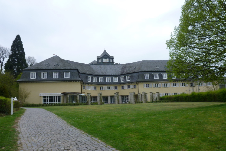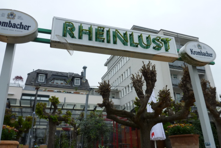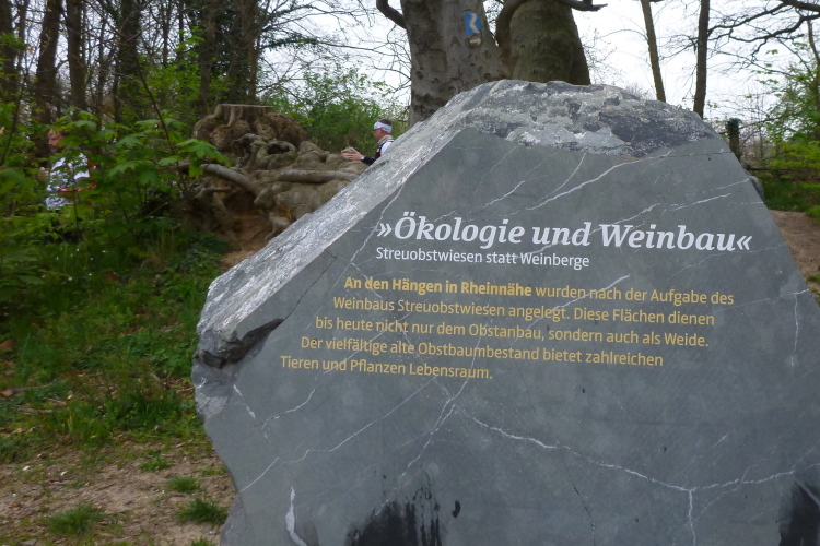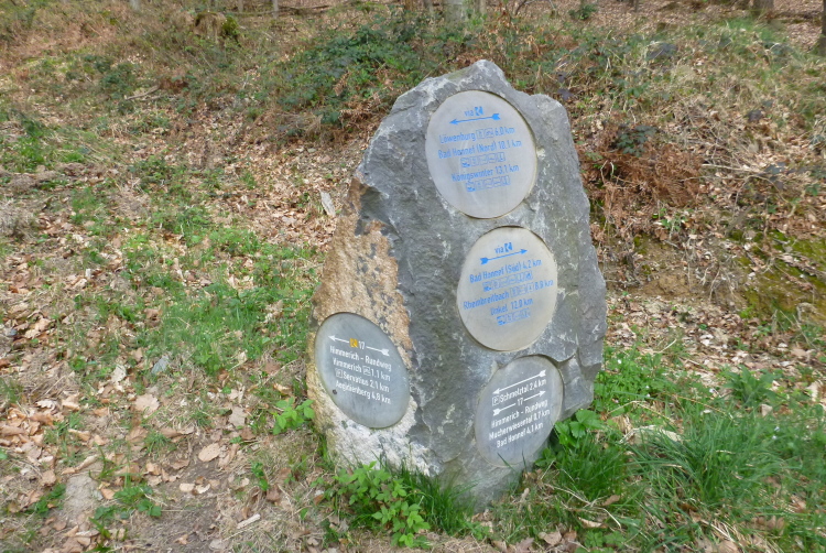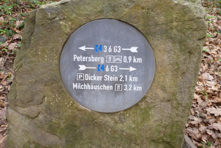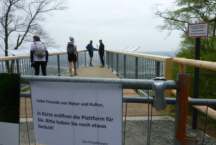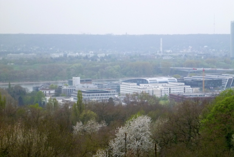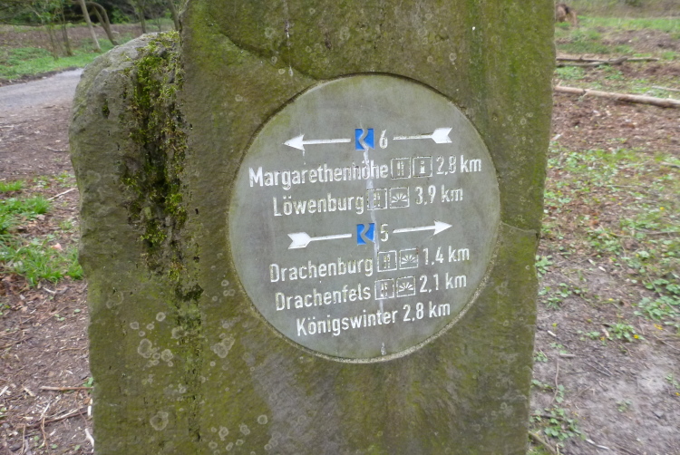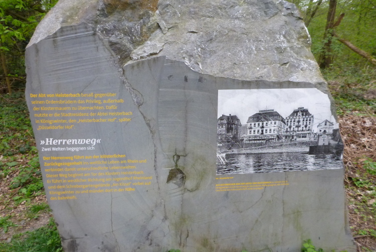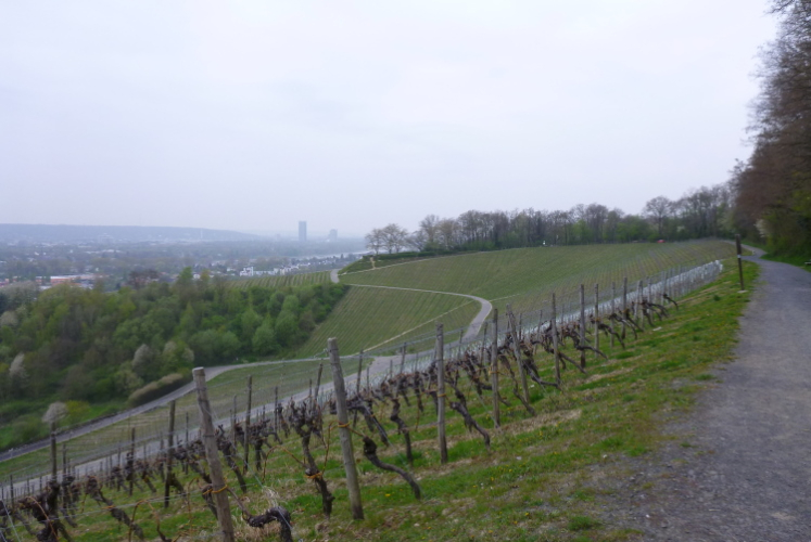 Wir entern den Wald, der sich hier noch Ennert nennt, bevor er später zum Siebengebirge wird. Oberhalb der unmittelbar am Rhein verlaufenden B 42 geht es rheinaufwärts über gute Waldwege in Richtung Oberdollendorf. Das nördlichste rheinische Weinanbaugebiet gewährt jede Menge schöne Blicke über die Wingerte (Weinberge). Der markante Petersberg mit dem Steigenberger Hotel auf der Spitze (früheres Gästehaus der Bundesregierung) ist unser nächstes Ziel, das wir durch ein kleines Tor auf steilem Weg erklimmen. Von dessen Terrassenseite aus kann man einen unvergleichlichen Blick auf das gegenüberliegende Bonn genießen, wenn das Wetter stimmt. Wir wollen uns nicht beschweren, es ist zwar diesig, aber zumindest trocken. Hier machen wir, wie immer, eine kleine Rast und nutzen auch die saubere, geheizte (!) Toilettenanlage.