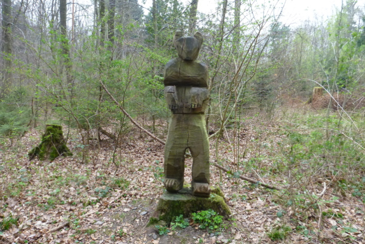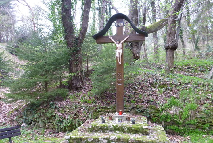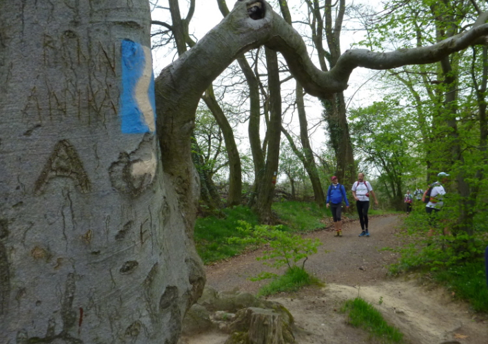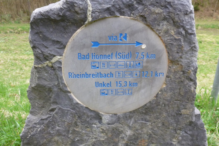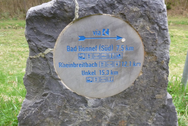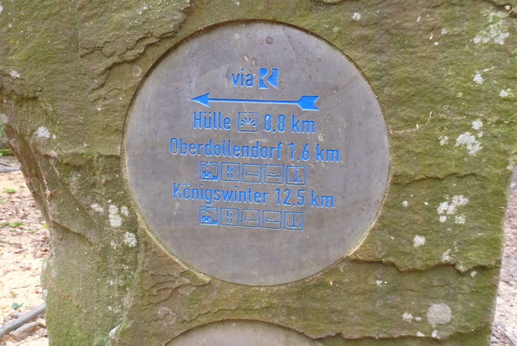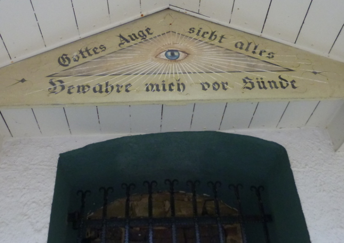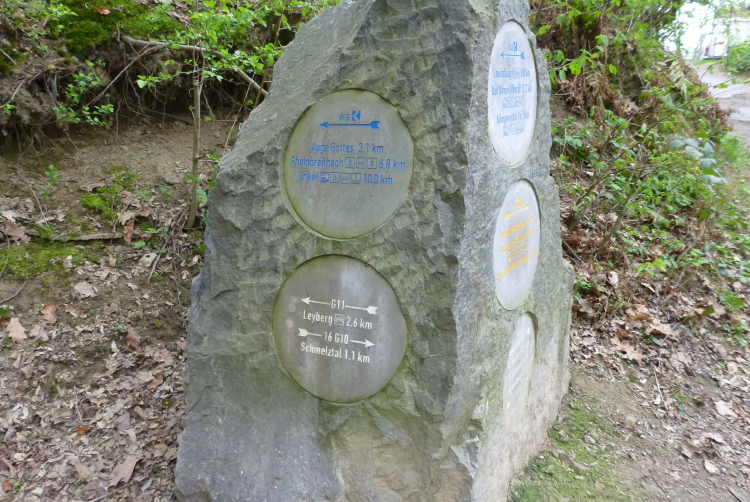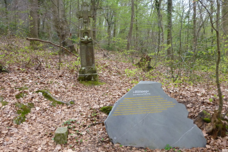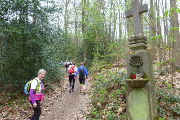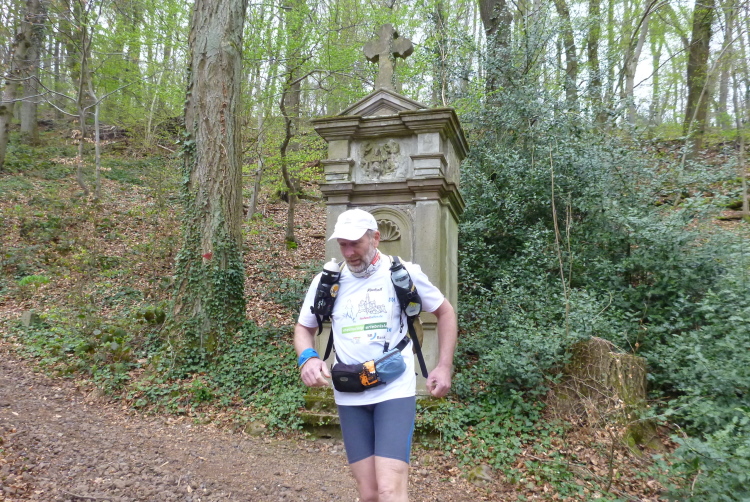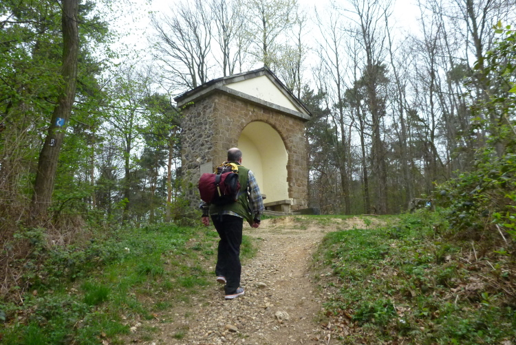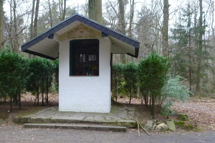 Wieder hinauf geht’s zum Leyberg. Nach 38 gemeinsamen km ergibt meine Raum-/Zeitberechnung eine zu erwartende deutliche Verspätung gegenüber der Planung und wir sind noch auf einen Geburtstag eingeladen. Daher ergreife ich die Flucht nach vorne und nehme die Beine in die Hände. Morgen Abend werden wir uns beim Abendessen anläßlich des Treffens mit dem glücklicherweise noch lebenden Namensgeber der Aktion, Benni, wiedersehen. Das gemalte „Auge Gottes“ auf diesem Heiligenhäuschen erinnert mich an meine früheren Türkeiurlaube. Auch befindet sich hier immer eine Verpflegungsstelle beim Siebengebirgsmarathon. Der anschließende Weg führt uns vorbei an einigen interessanten Bildstöcken.