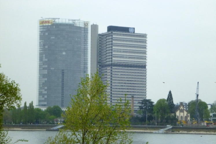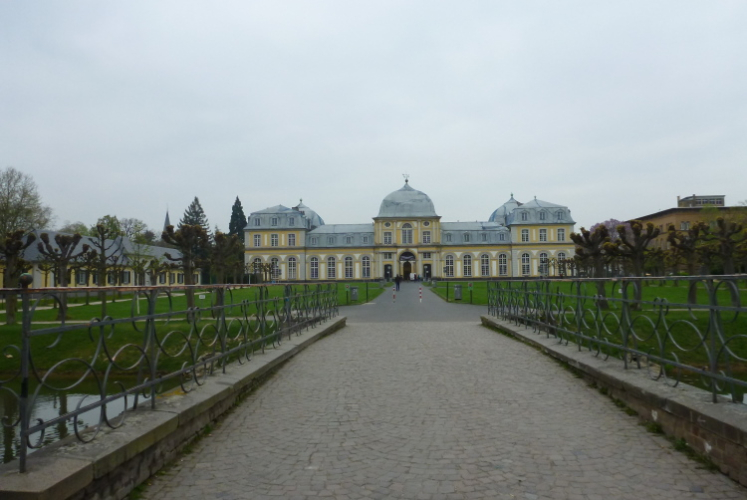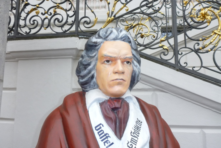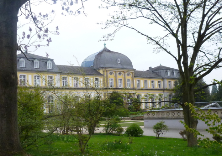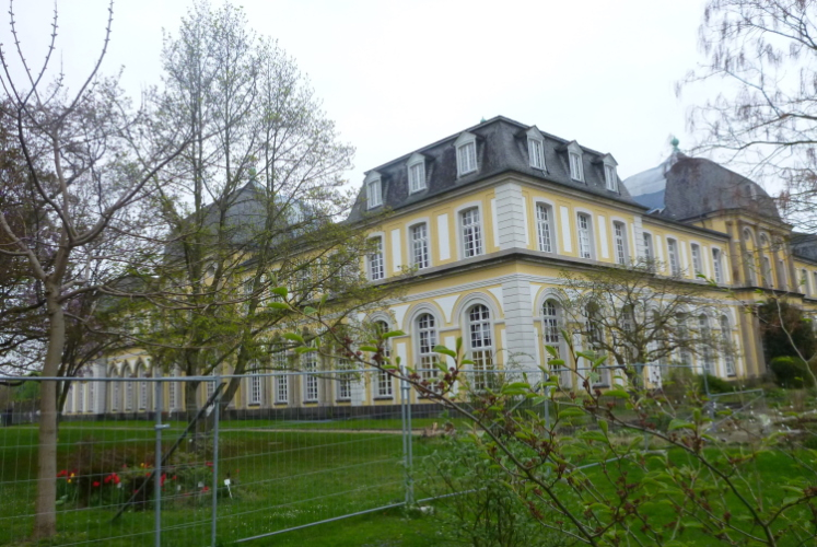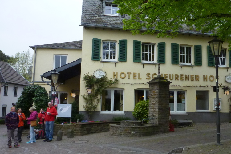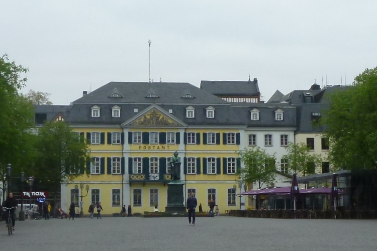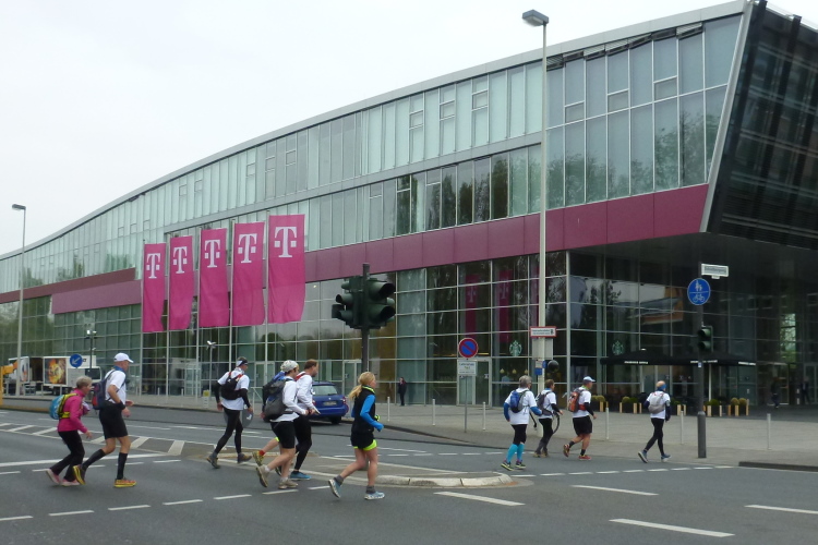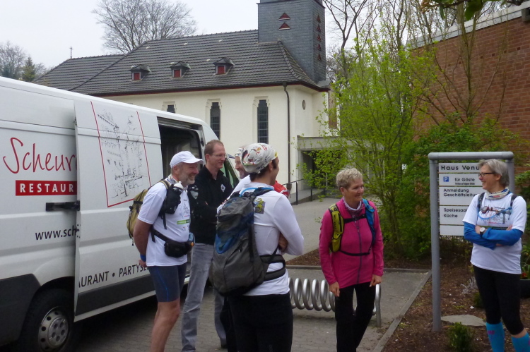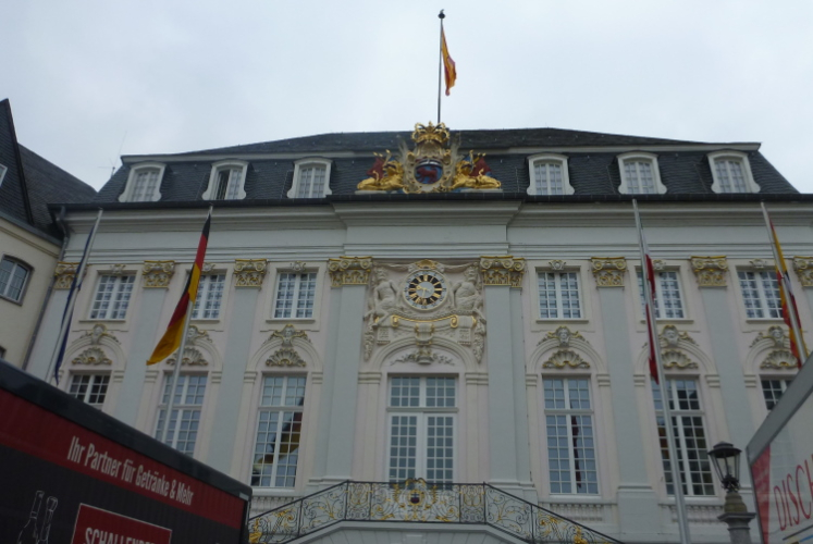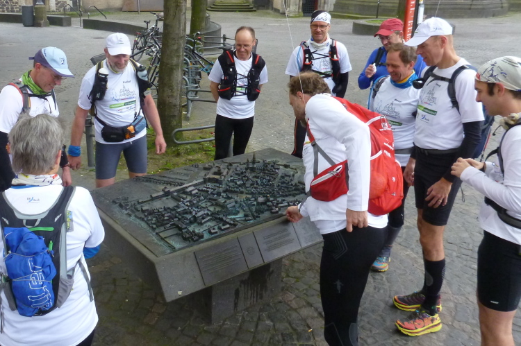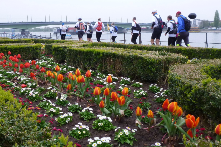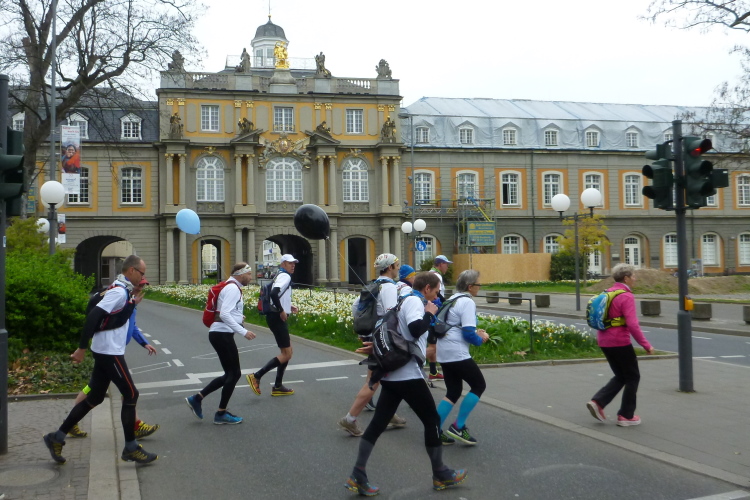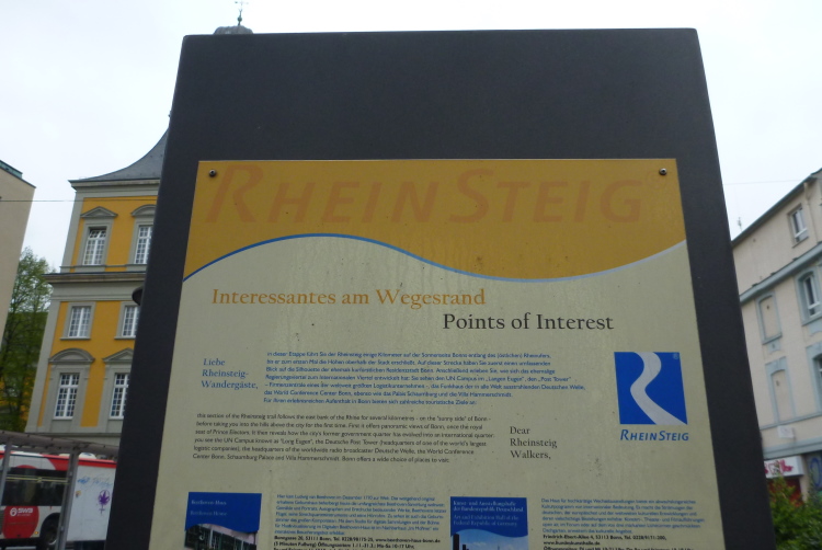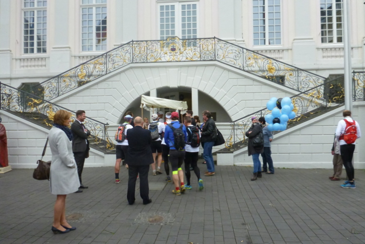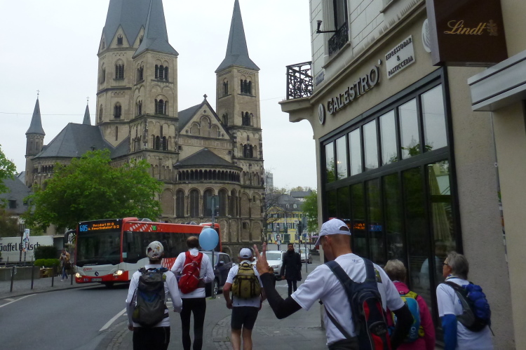 Ich fahre ans heutige Etappenende nach Unkel/Scheuren, wo mich der nette Hotelier zum Start mitnimmt. Ein tolles Prinzip, welches das Gepäck-Transportproblem löst: Immer holt der nächste Gastwirt das gesamte Gepäck am Etappenstart ab. Wie jeden Tag wird um 8:30 Uhr gestartet und wieder begleiten uns die Kindergartenkinder von nebenan auf den ersten Metern, Hand in Hand geht es los. Dann haben wir ein Einsehen. Nämlich mit den Erzieherinnen, die bereits schwer am Pumpen sind, die Kleinen könnten durchaus noch weiterlaufen. Bergab geht es in die Bonner Innenstadt zum alten Rathaus. Dort, am offiziellen Beginn des Rheinsteigs, werden wir, das sind heute knapp zwanzig Läuferinnen und Läufer, von der Stadtverwaltung, dem Hauptsponsor und der Vorsitzenden des Vereins öffentlichkeitswirksam begrüßt und pressebegleitet auf die Reise geschickt.