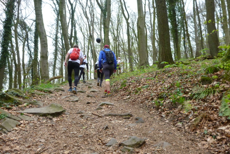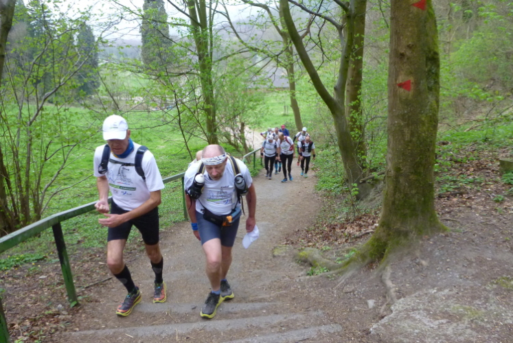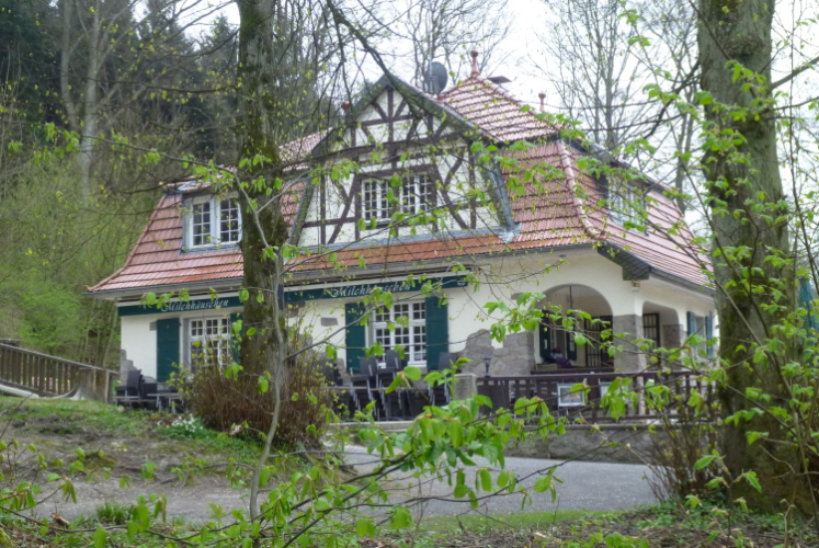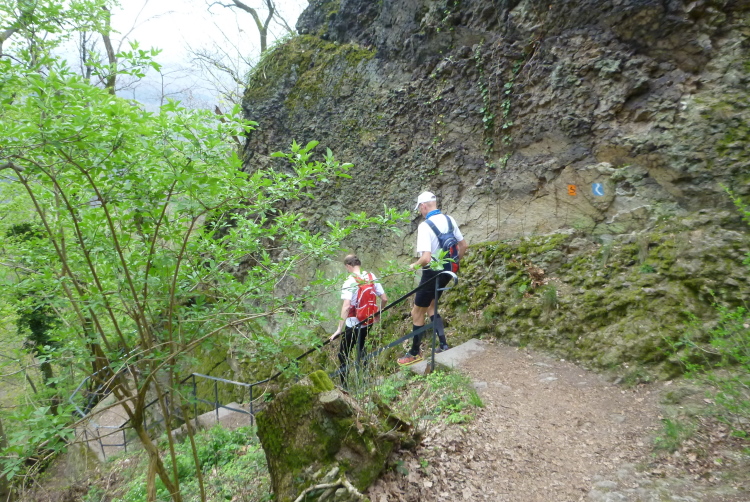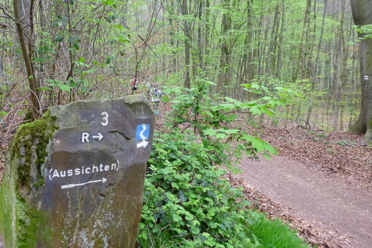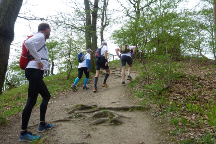 Den Petersberg müssen wir wieder über viele Stufen hinunter, die feucht ganz schön gefährlich sind. Jogi Löw würde sagen: Höckschte Aufmerksamkeit! Sehr aufmerksam müssen wir auch deshalb laufen, denn schnell hat man mal eine Abzweigung verpaßt und muß wieder den Pfad der Tugend finden. Wir überwinden den vielbefahrenen Zubringer zur A 3 und sind im Gelände der traditionellen Läufe des LT Siebengebirge. Vom Geisberg haben wir eine tolle Sicht rheinaufwärts, bevor uns der Weg wieder hinabführt. Wir passieren nach einer langen Bergabpassage das sog. Milchhäuschen, ein hochbeliebtes Ausflugslokal.