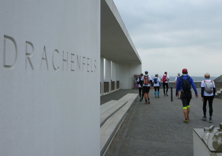 Der nächste dicke Brocken, das erkennen wir nach der Unterquerung der Gleisanlage schnell, wird der Drachenfels. Zwischenziel auf dem Weg zum „höchsten Berg Hollands“ (früher fielen die Kameraden hier zu Tausenden ein) ist zunächst die Drachenburg, ein frisch renovierter Traum in Stein mit wechselvoller Geschichte. (Erst) 1882 legte Baron Stephan von Sarter, er war durch Börsenspekulationen zu großem Reichtum gelangt, den Grundstein zu seinem repräsentativen Wohnsitz, einer Mischung aus Villa, Burg und Schloss. Er wohnte hier zwar nie, hinterließ uns aber ein Kleinod, an dem vorbeizulaufen eine Freude ist. Leider bleibt uns heute durch eine Drachenfels-baubedingte Umleitung des Rheinsteigs dieser Anblick verwehrt. Wer hier noch nicht dabei war, hat echt etwas verpaßt.