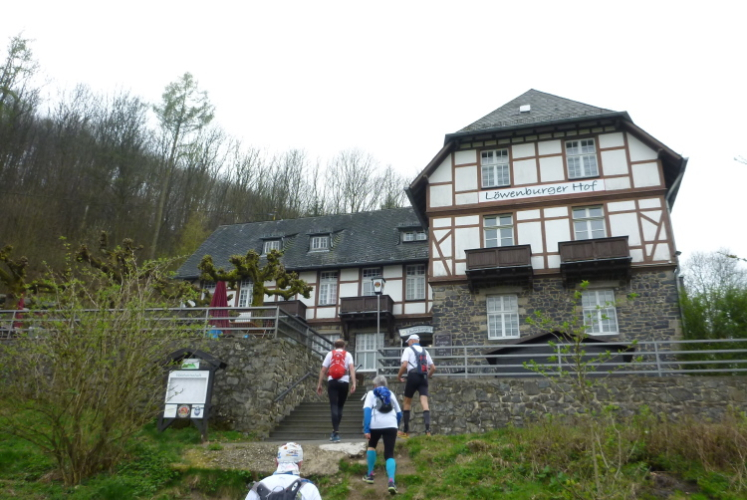 Nach dem Erklimmen des Breibergs, umrunden wir (leider nur) die ruinöse Löwenburg. Nach 34,5 km legen wir eine etwas längere Rast im dortigen Gasthaus ein. Herrlich, auf den Tischen sind jede Menge Kaltgetränke bereitgestellt, Wasser, Apfelschorle und Cola können kaum so schnell nachgereicht werden, wie sie in unseren Hälsen verschwinden. Ich sage nur: Rhabarberstreusel und Milchkaffee. Es geht uns gut. Erstaunlicherweise komme ich nach der Sitzpause problemlos wieder in den Laufmodus. Anschließend stürzen wir uns hinab ins Schmelztal. Seit 1753 wurde hier für rund 120 Jahre intensiver Bergbau (Kupfer, Blei, Zink und Eisen) inkl. des Schmelzens (daher der Name des Tals) betrieben werden.