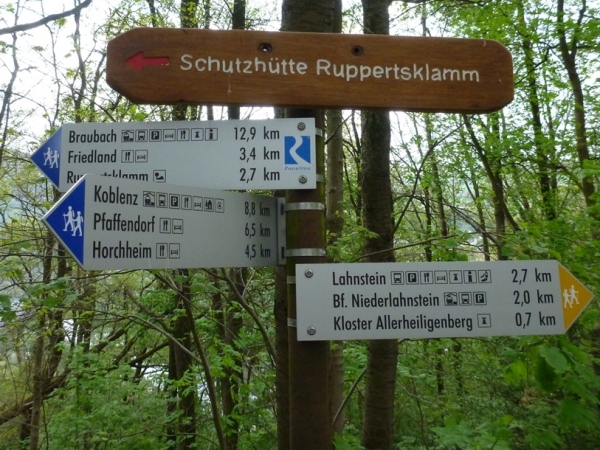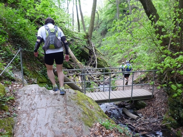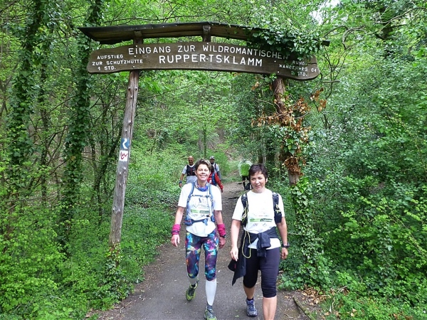 Der Leinpfad, auf dem früher Pferde die Schiffe rheinaufwärts zogen, bringt uns in den Koblenzer Stadtteil Pfaffendorf. Ein Unentwegter hat die Vereinsfahne des 1. FC Kaiserslautern herausgehängt und hofft wohl, daß das zu erwartende Gemetzel im Halbfinale des DFB-Pokals bei den Bayern nicht allzu drastisch ausfällt. Wir verlassen den Rhein, steigen ins Bienhorntal auf und bekommen so einen ersten Geschmack von den heutigen schönen Trailabschnitten. Gut ausgebaute Waldwege und schöne schmale Trampelpfade bringen uns zum Einstieg in die Ruppertsklamm. Die zu erleben ist der Oberhammer, eingangs habe ich meine Gefühle beschrieben. Schade, daß die im düsteren Licht gemachten Fotos dieses herrliche Stückchen Erde nicht ansatzweise so schön wiedergeben, wie es ist.
