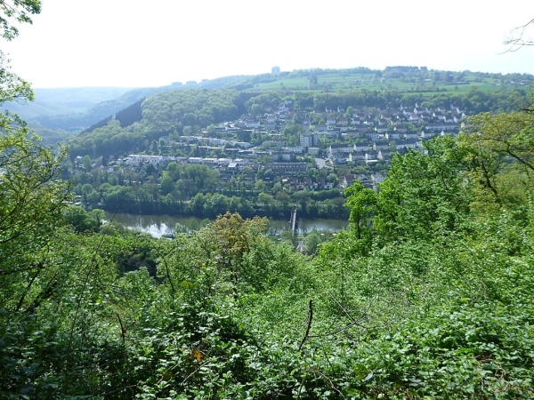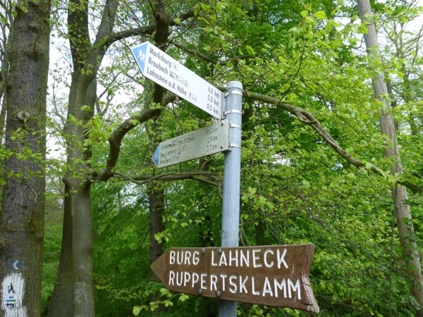 Herrliche Ausblicke auf den Höhen sorgen immer wieder für Fotostopps, die sein müssen und auch dürfen. Was haben wir nur ein Schwein mit dem Wetter! Angekündigt war der schlechteste Tag der Woche mit immer wieder einsetzenden Regenschauern. Wir erleben häufig Sonne und der einzige nennenswerte Guss erfolgt während unserer Pause in der Marksburg. So ließ sich der gut aushalten. An einer eisenhaltigen Quelle im Wald erfreut uns der Lahnsteiner Globus-Markt mit einer schon wieder hochwillkommenen Verpflegungsstelle. Ich weiß wirklich nicht, wie ich hier und heute mit einer negativen Kalorienbilanz nach Hause kommen soll. Hoch über Osterspai erklimmen wir eine Höhe und der Blick nach rechts zeigt einen schier undurchdringlichen grünen Teppich, nichts, aber auch gar nichts weist auf Zivilisation hin. So ähnlich muß sich das Bild flächendeckend den Römern dargeboten haben, als sie sinnvollerweise beschlossen, unter anderem uns Westerwälder Germanen bleiben zu lassen.