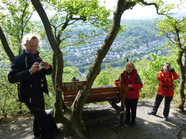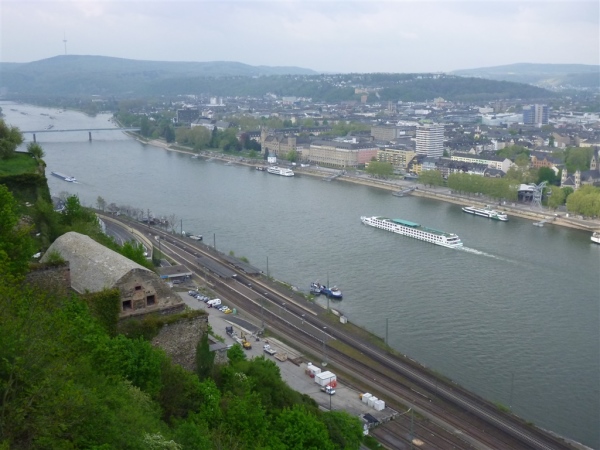 Nach einem ausgiebigen Blick auf das deutsche Eck mit dem Reiterstandbild Kaiser Wilhelms I. und einigen kompetenten Erklärungen der mitlaufenden Projektmanagerin Wandern, Karin Hünerfauth-Brixius von der Rheinland-Pfalz Tourismus GmbH, steigen wir ins Mittelrheintal hinab und laufen zunächst an den Gestaden von Vater Rhein entlang in Richtung Süden. Ich liebe meine Geburtsstadt und freue mich, hintereinander das kurfürstliche Schloß, das jetzt leerstehende ehemalige Grand Hotel, das traumhafte Regierungsgebäude der ehem. Rheinprovinz, die Schiffsbrücke, das Pegelhaus (ehem. Rheinkran) und das Weindorf auf der gegenüberliegenden Seite bewundern zu können.