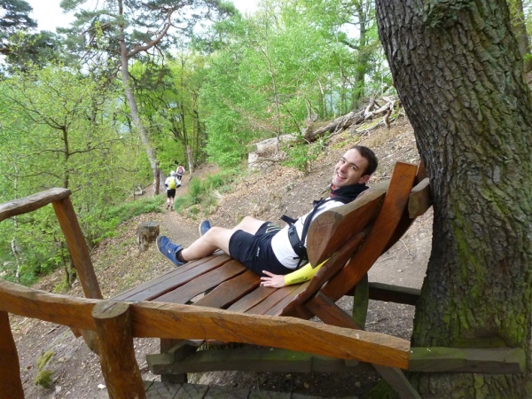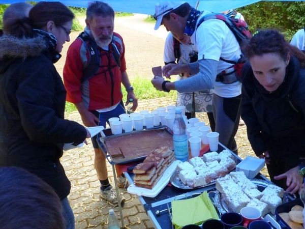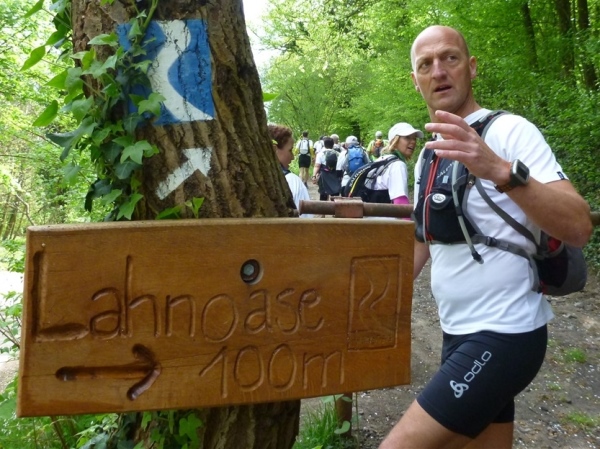 Eine gemütliche Art der Fortbewegung ist das, was wir hier und heute betreiben. Und das ist gut so, denn die Gegend ist zu schön zum Vorbeihetzen und durch das langsame Tempo und immer wieder Warten auf Nachzügler können auch Marathonnovizen einen Ultra schaffen. Als Etappenläufer muß man auch immer berücksichtigen, daß die Masse der Läufer in den Vortagen schon drei schwere Ultras von je über 50 km mit jeder Menge Höhenmeter hinter sich hat. Am Rande Lahnsteins wartet Paradies Nr. 2: Das Running Team Bad Ems hat einen sagenhaften Verpflegungsstand mit allem, was man sich vorstellen kann, aufgebaut. Alleine drei Bleche selbstgemachten Kuchen und eines mit einer Art Lauchkuchen (dem Zwiebelkuchen ähnlich) machen die Auswahl schwer, denn alles kann man unmöglich essen. Dazu gibt’s auch frischen Kaffee. Einfach toll.