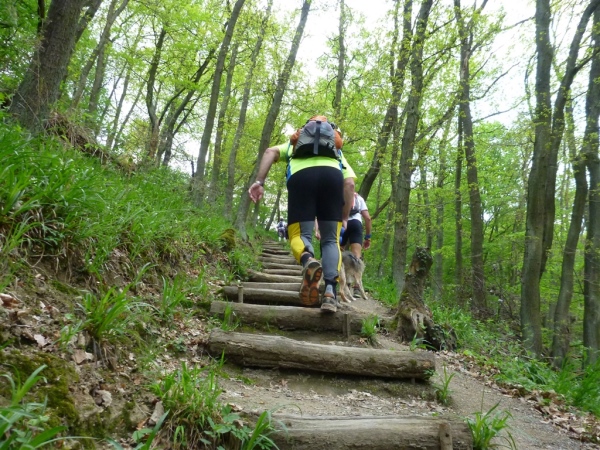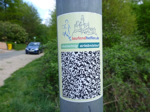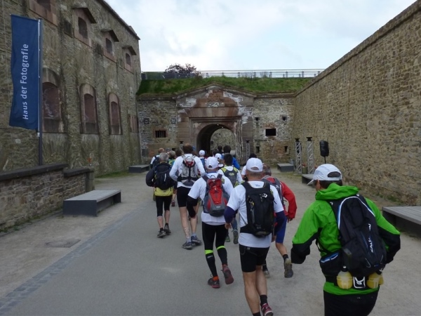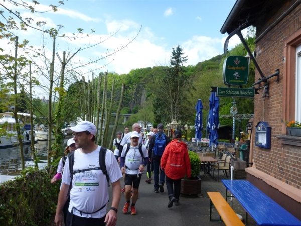 Schwer fällt mir das Wiederanlaufen. Wenn ich ehrlich bin, die Pause ist mir zu lang, aber ich bin ja nur Etappenläufer. Aber wenn Du schon fünf Stunden unterwegs bist, schaltet der Körper nach einer gewissen Phase auf Regeneration um und will nicht mehr so richtig. Hilft ihm heute aber nichts. Unsere liebe Co-Autorin Birgit Fender, die den Rheinsteig mit ihrem Norbert ebenfalls unsicher macht, fotografiert sich auch die Finger wund und den Akku vorzeitig leer. Die beim 6-Stunden-Lauf geklaute Kamera wurde wieder ersetzt, auch daher dürfen wir von ihr wieder einen Bericht, aber über die gesamte Tour, erwarten. Jörg, der Flussläufer, ist mit Hund dabei und der ist unglaublich. Über 40 km zieht der, was das Zeug hält, und röchelt dabei, als hätte sein letztes Stündlein geschlagen. Das verträgt nicht jeder von uns und so halten manche größeren Abstand zu ihm. Aber er ist ganz brav und freut sich seines Lebens.