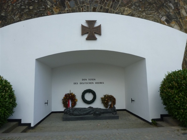 Seit der Bundesgartenschau vor wenigen Jahren ist das Vorfeld der Festung Ehrenbreitstein, die wir jetzt ansteuern, mustergültig hergerichtet und immer noch gut in Schuß. Toll ist auch die begehbare Aussichtsplattform, von der man einen schönen Blick auf die Stadt Koblenz und das Rheintal hat. Leider muß man seit einigen Jahren Eintritt zum Betreten der Festung berappen, wir aber werden verschont und dürfen deren Schönheit für „umme“ genießen. Ja, wirklich Schönheit, denn man hat gewaltige Summen verbaut, um die riesige Anlage wieder herzurichten. Daß sie als Hauptwerk der ehemaligen Festung Koblenz überhaupt noch vorhanden und der Schleifung aufgrund des Versailler Vertrages entging, ist nur Glück und ihrer schon zum damaligen Zeitpunkt militärischen Bedeutungslosigkeit zu verdanken. Heute können wir froh darüber sein, denn sie ist ein echter Publikumsmagnet.