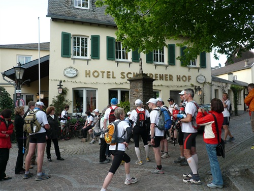Zum ersten Mal ist nicht die Bonner Jugendherberge Ausgangspunkt dieser besonderen Rheinreise, sondern ein Gästehaus des Erzbistums Köln am Venusberg. Ach, alles ist trotzdem so schön wie immer: Mein Freund Gerhard liefert uns (auch Hannelore und Jochen sind dabei) brav ab, es erfolgt eine herzliche Begrüßung mit den Mahlburgs und etlichen alten Bekannten... Die Komplettläufer haben ihr Gepäck schon parat gestellt, denn dieses wird jeweils mit dem Auto zur nächsten Unterkunft gefahren.