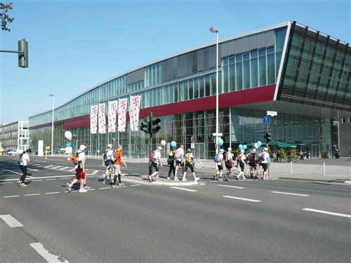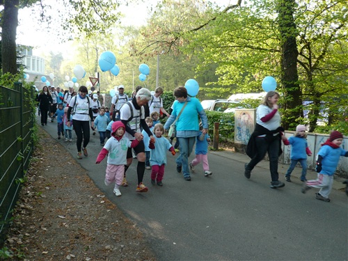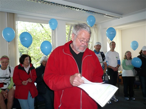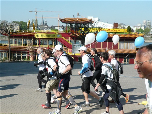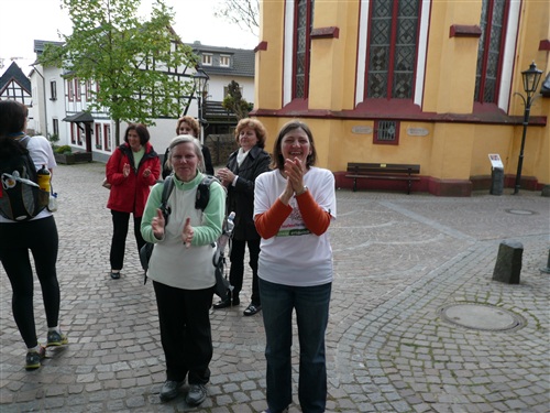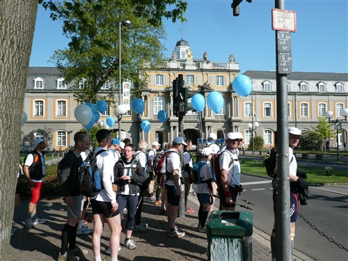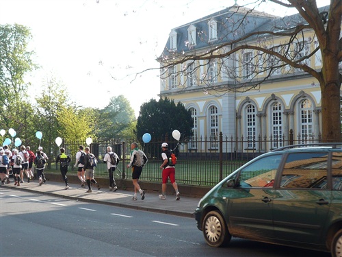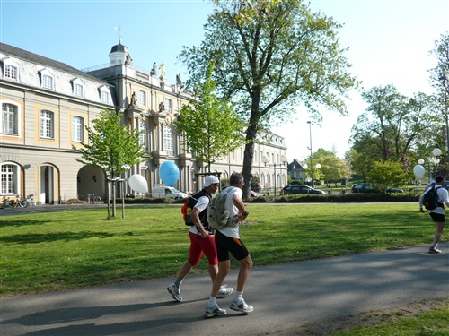 Das Wetter verspricht heute nach dem Temperatursturz vom Dienstag, der den Frühsommer jäh beendete, wieder ganz anständig zu werden. Zwar ist es morgens mit ganzen 3° noch sehr frisch, um nicht zu sagen saukalt, aber 15° sind für den Nachmittag versprochen. Und weitestgehender Sonnenschein. Um 8.30 Uhr geht es los. Pünktlich wie immer, bei Rolf herrschen geordnete Verhältnisse. Zunächst geht es, anfangs begleitet durch eine Kindergartengruppe, im lockeren Trab bergab in die Innenstadt zum historischen Bonner Rathaus, an dem der Rheinsteig offiziell beginnt oder endet, je nachdem, von welcher Seite man sich ihm nähert. Hier wartet ein freundlicher Empfang der Stadt auf uns; eine Duchenne-betroffene Mutter hält eine bewegende Rede, die uns den guten Zweck unseres Laufs deutlich vor Augen führt. Danach gibt es noch eine weitere kleine Einlage mit Kindergartenkinder, die der WDR filmisch begleitet und dann sehen wir zu, dass wir die Stadt hinter uns lassen, denn Strecke und Lauf leben vom Naturerlebnis.