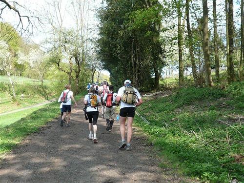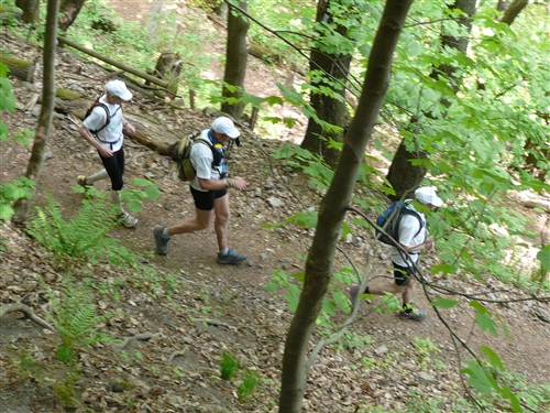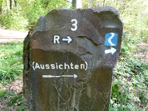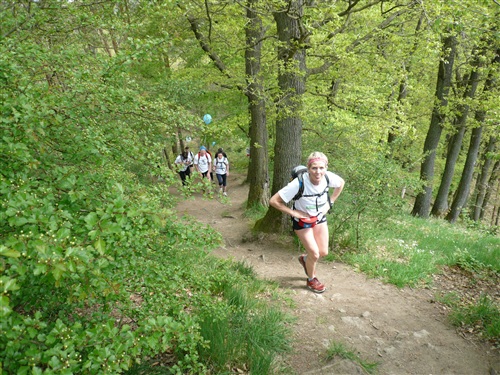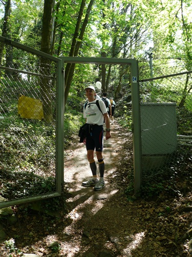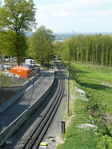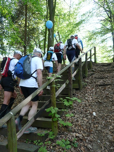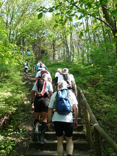 Wir überqueren den Rhein über die Kennedy-Brücke, die mittlere der 3 Bonner Brücken, die nach jahrelanger Renovierung endlich wieder frei nutzbar ist. Sie hat, das ist bisher wohl einmalig, eine durchgehende Photovoltaikanlage erhalten. Wie immer sind alle froh, als die Bebauung dünner wird und sich Möglichkeiten zur unauffälligen Erleichterung ergeben. Über die Beueler Rheinauen – frischgebackene Abiturienten machen lautstark Party und stehen Spalier - passieren wir zunächst das Hauptquartier der Telekomiker (T-Online, zugleich Startbereich des Rheinsteig-Extremlaufs über 34 km und 1.200 Höhenmeter) und kommen durch das sich von Jahr zu Jahr weiterentwickelnde Neubaugebiet von Küdinghoven. Die Vegetation in den Gärten hat in den letzten Jahren mächtige Fortschritte gemacht. Und nach der Überquerung von Straßenbahnlinie und A 59 stehen wir schon bald am Eingang des Waldgebiets „Ennert“ als Einstieg ins Siebengebirge und entern diesen über eine ganze Reihe Stufen. Hier gibt’s beim Rheinsteig-Extremlauf immer den ersten Stau.