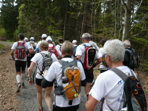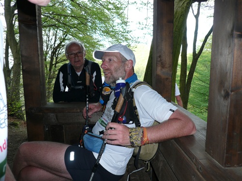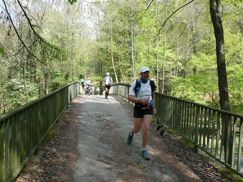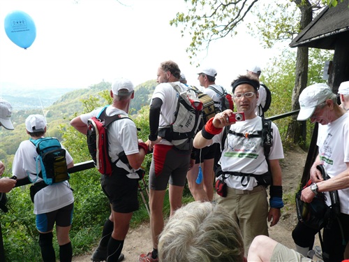 Sehr lange waren wir unterwegs, da könnte man meinen, das sei nicht anstrengend. Eher das Gegenteil ist der Fall, meine ich. Das ständige Abstoppen, Wiederanlaufen, nie einen Rhythmus zu haben, Päuschen hier, Päuschen dort, zehren mehr an einem, als wenn man durchliefe. Und die letztlich gelaufenen 57 km mit rund 2.000 Höhenmetern sind und bleiben doch ein kerniger Ultra. So bin ich ehrlich nicht böse, daß diese Etappe meine einzige bleibt und ich mein seit dem langen Abstieg von der Löwenburg doch arg strapaziertes Knie zuhause pflegen kann. Trotzdem beneide ich den Rest, der sieben weitere tolle Etappen bei traumhaftem Wetter weiterlaufen darf.
