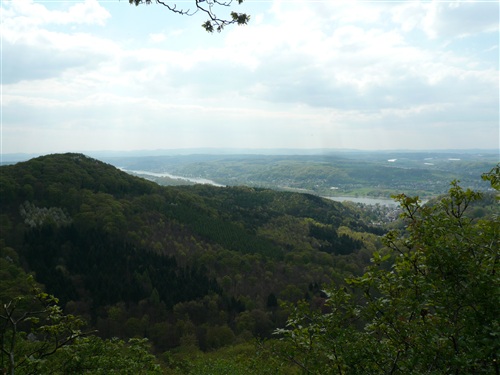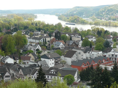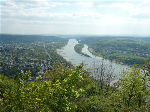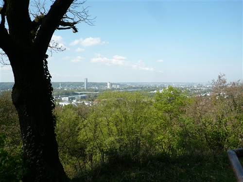 Oberhalb der unmittelbar am Rhein verlaufenden B 42 geht es rheinaufwärts über gute Waldwege in Richtung Oberdollendorf. Das nördlichste rheinische Weinanbaugebiet gewährt jede Menge schöne Blicke über die Wingerte (Weinberge). Der markante Petersberg mit dem Steigenberger Hotel auf der Spitze (früheres Gästehaus der Bundesregierung) ist unser nächstes Ziel, das wir durch ein kleines Tor auf steilem Weg erklimmen. Von dessen Terrassenseite aus kann man einen unvergleichlichen Blick auf das gegenüberliegende Bonn genießen, wenn das Wetter stimmt, was heute endlich einmal der Fall ist. Hier machen wir, wie immer, eine kleine Rast und nutzen auch die saubere Toilettenanlage. Letztes Jahr sind wir hier noch, total verdreckt und naß, zum Kaffeetrinken und Kuchenessen auf Hochflorteppichboden eingefallen.