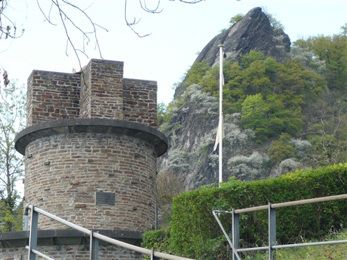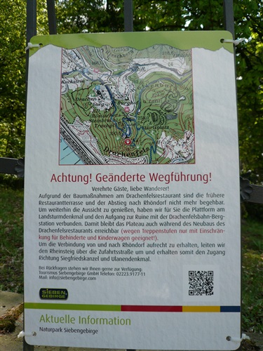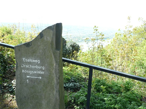 Weiter geht es den Drachenfels steil hinauf. Früher wurden die Käsköppe – jetzt ist’s mir doch herausgerutscht! – auf Eseln hinaufbefördert. Jetzt sind wir die Esel, die teilweise im Laufschritt an Höhe gewinnen. Und das auf nur zwei Beinen. Oben angekommen überwältigt einen der Blick schlechthin. Der wird natürlich reichlich genossen, aber der restliche Weg ist noch weit und deshalb machen wir uns wieder auf die Socken. Auf dem Petersberg ist übrigens jede Menge Lärm, denn die gröbsten Bausünden aus den Siebzigerjahren werden mit Preßlufthämmern beseitigt und machen hoffentlich schönerer Bebauung Platz.