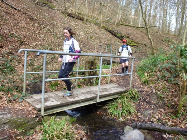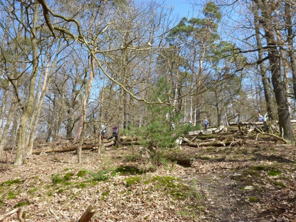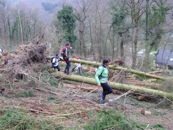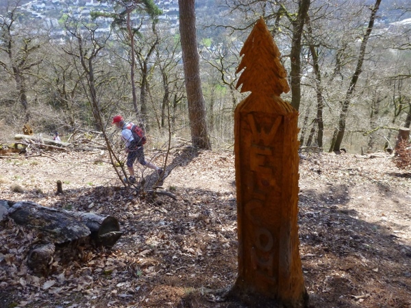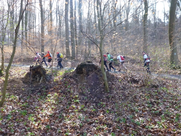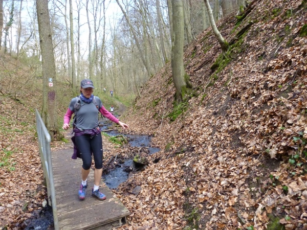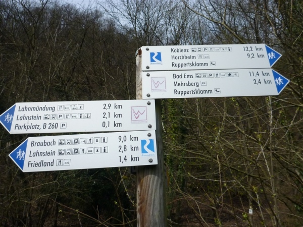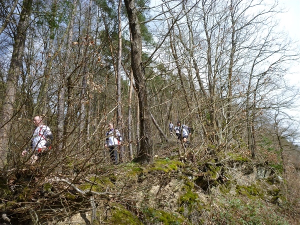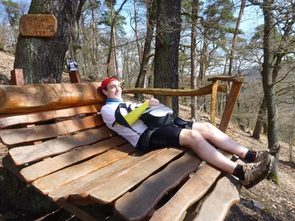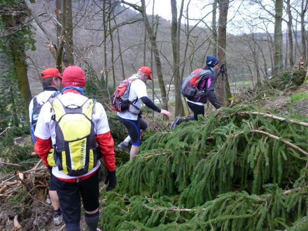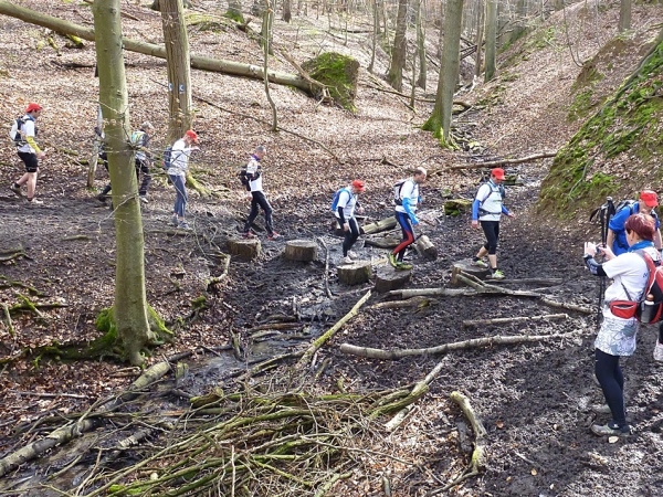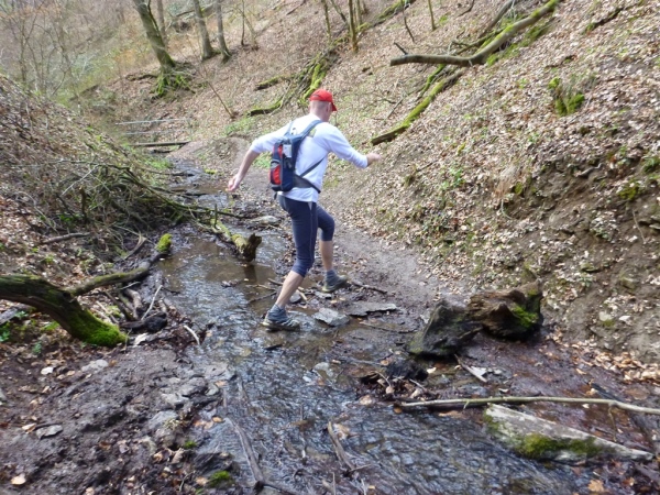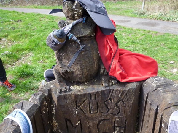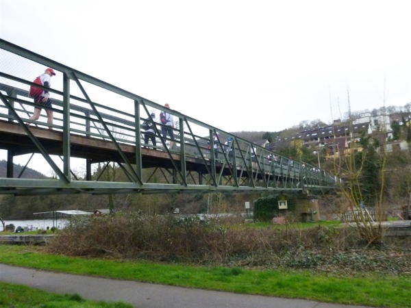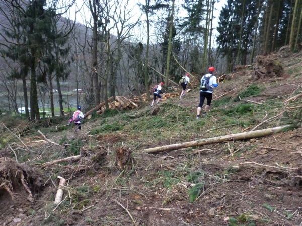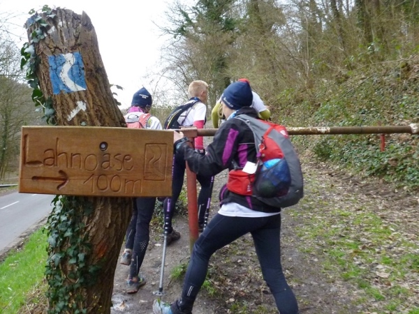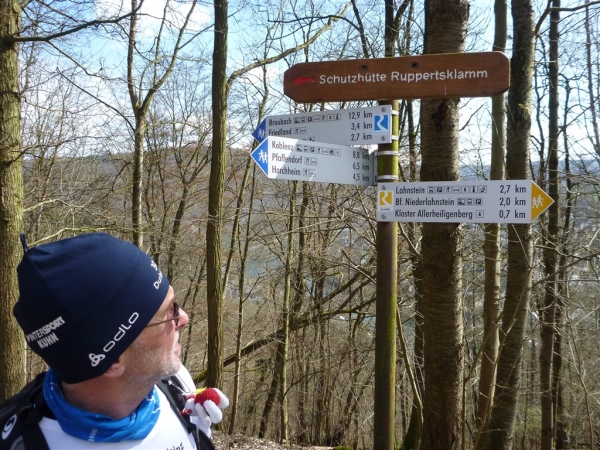 Ein paar Meter entlang der Lahn bringen uns auf eine Fußgängerbrücke, über die wir auf die andere Seite wechseln. In der Mitte des kleinen Flusses befindet sich ein Grasstreifen mit Pavillons und Gartenstühlen. Idylle pur! Nur nicht heute, denn gerade pfeift der Wind wieder eiskalt, die Wetterverhältnisse wechseln ständig hin und her. Auf dem folgenden Aufstieg überrascht uns ein massiver, frischer Holzeinschlag, der uns eine muntere Kletterpartie mit viel Spaß einbringt. Aber auch das ist irgendwann einmal geschafft, so geht es weiter auf die Höhe zur Aspichklamm. Die ist allerdings wesentlich moderater zu bewältigen und nachdem Rolf die Jagd freigegeben hat, brettert alles, je nach Lust und Laune, ins Tal. Hinter dem Lahnsteiner Stadtteil Einmuth verlassen wir die Zivilisation und steigen erneut auf. Rolf hat hier die „Bergwertung“ ausgeschrieben, da darf ich mich nicht lumpen lassen und hechele hoch, zartfühlende Seelen treiben mich zusätzlich an („Du hast auf Malle doch gut trainiert!“).