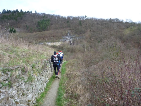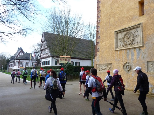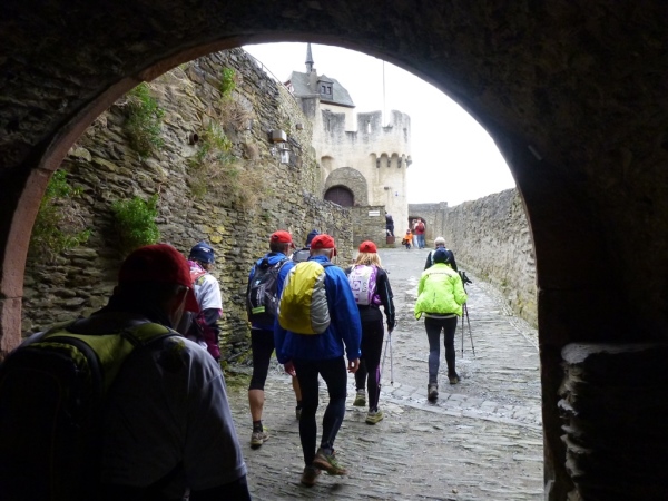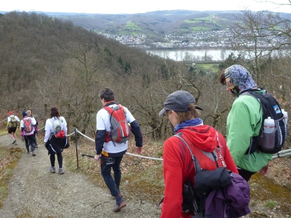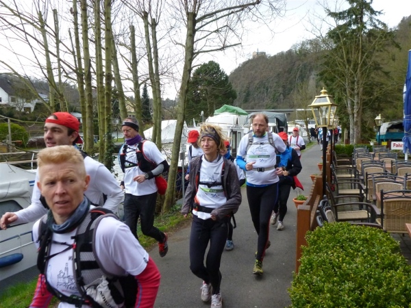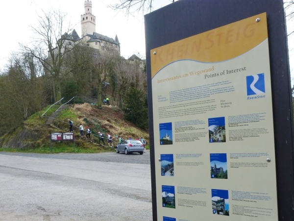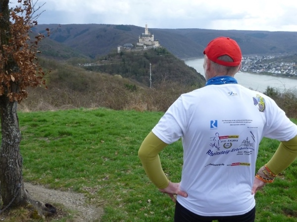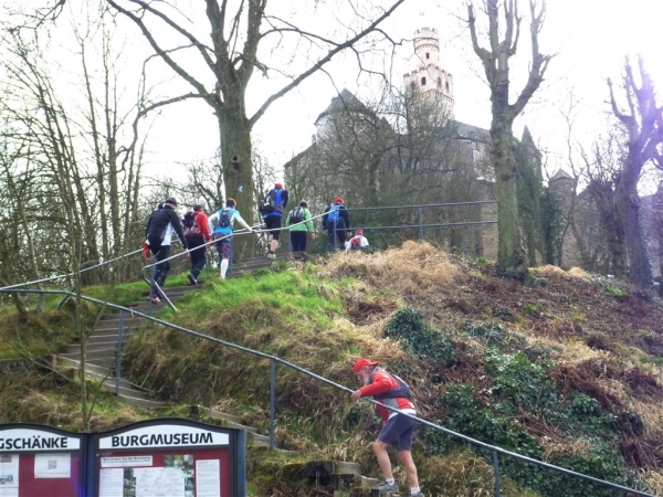 Derart ernüchtert erwartet uns als weiterer Höhepunkt die Marksburg hoch über Braubach. Diese einzige nie zerstörte Höhenburg am Rhein ist quasi das Wahrzeichen des Rheinsteig-Erlebnislaufs. Eine vom Marksburger Gastronomen gesponserte heiße Gemüsesuppe und ein bleifreies Weizen bringen die Lebensgeister wieder zurück. Das Wiederanlaufen fällt nicht leicht.