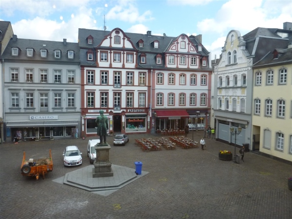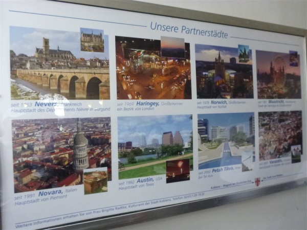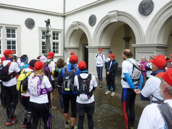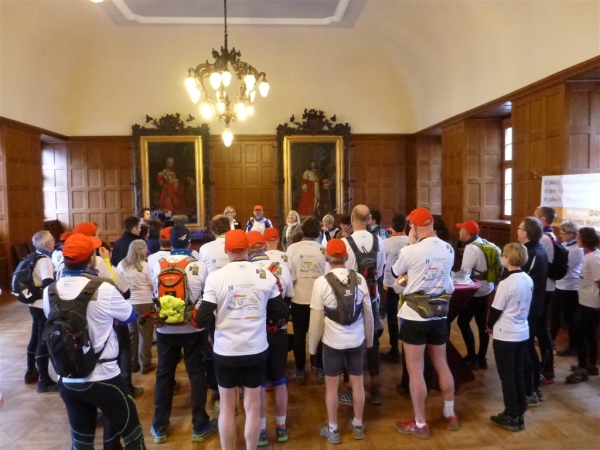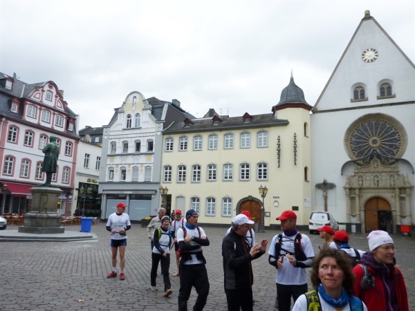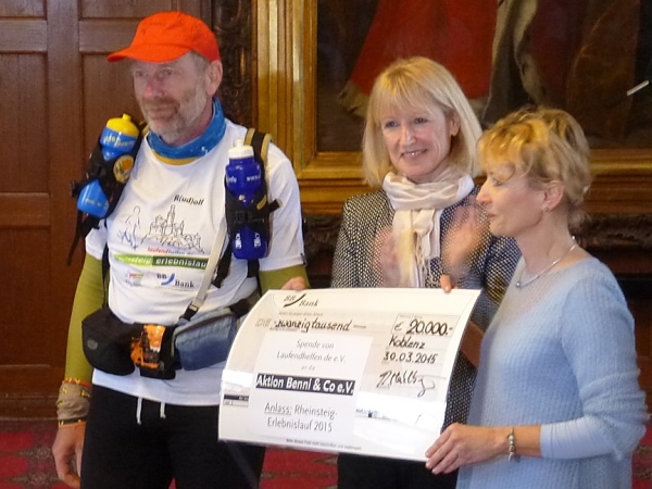 Man ist doch vor Überraschungen nicht gefeit: Heute steht ein öffentlichkeits- und spendenwirksamer Empfang im altehrwürdigen Koblenzer Rathaus an und die Stadt hat uns eine Freifahrt mit der die Festung und die Altstadt verbindenden Seilbahn gestiftet. Fein, so geht es gelenk- und muskelschonend bei tollen Aussichten talwärts. Ich freue mich, den Koblenzer Ex(?)-Ultraläufer und Mitorganisatoren der drei Trans-Europa-Läufe, Joachim Barthelmann, zu treffen, der uns die Ehre gibt. Weiter gute Besserung, lieber Joachim, damit es mit dem Laufen wieder klappt! Im ehemaligen Jesuitenkolleg empfängt uns die Bürgermeisterin in Vertretung des urlaubenden OB, zahlreiche Spenden wechseln die Seiten und am Ende übergibt Rolf dem Verein „aktion benni & co.“ die Summe von 20.000 €. Darauf können er und seine Frau Brigitte stolz sein und dafür nimmt man als Läufer auch gerne lange Wartezeiten in Kauf, schließlich geht es ja neben dem Lauferlebnis im Wesentlichen um die karitative Sache.