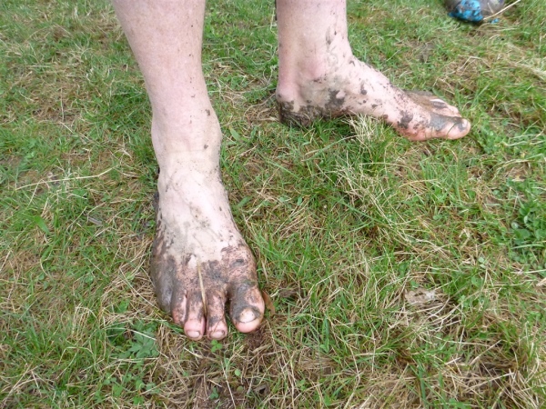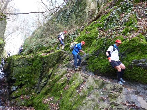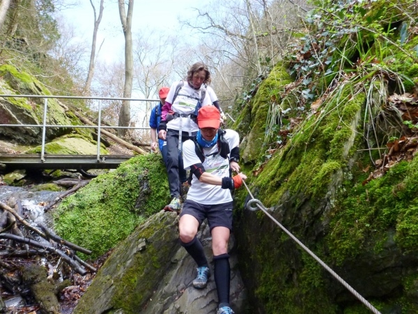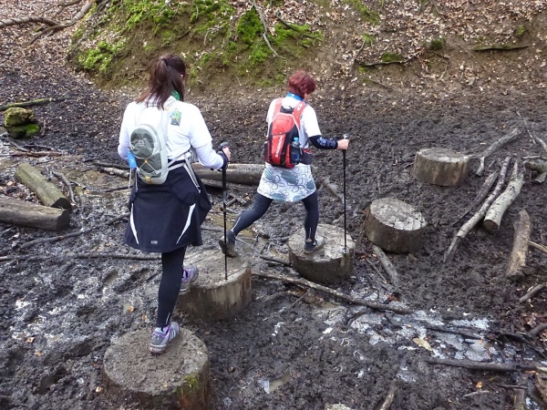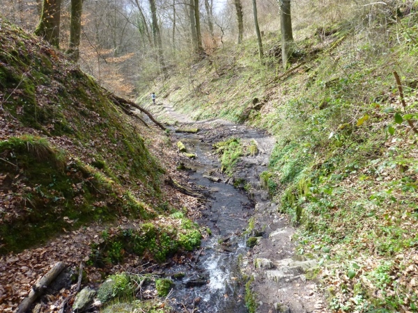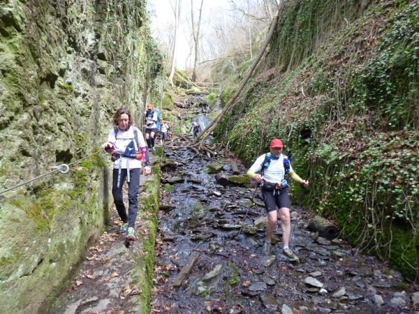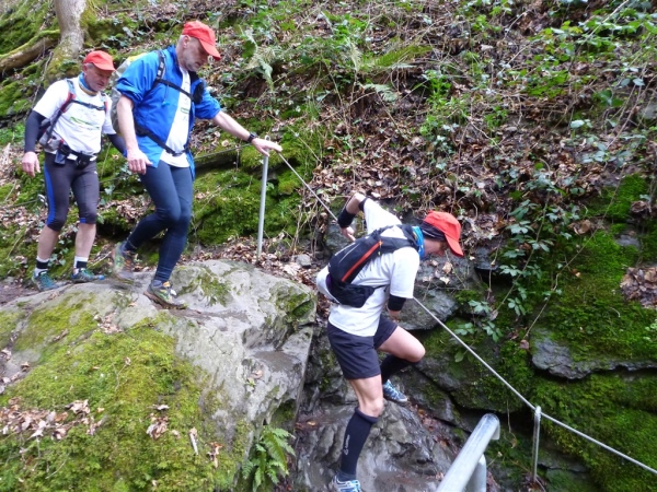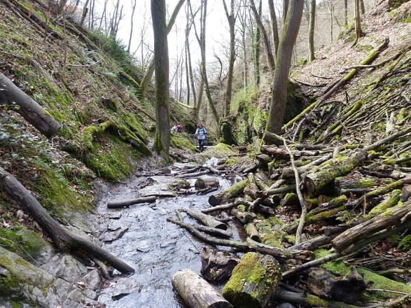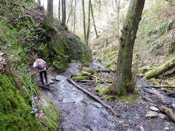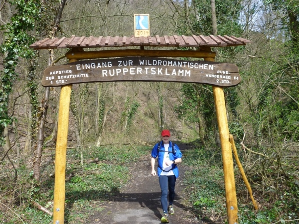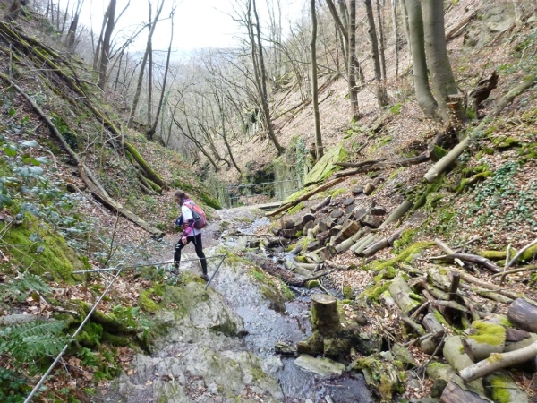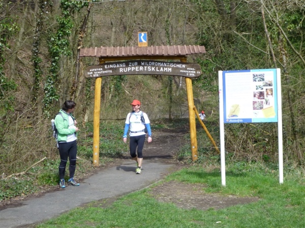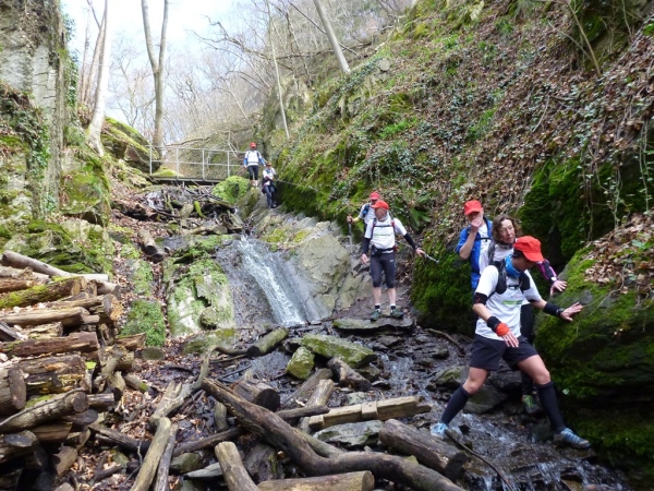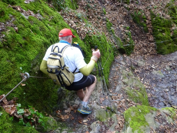 Gut ausgebaute Waldwege und schöne schmale, heute jedoch äußerst matschige Trampelpfade, teilweise wirklich anspruchsvoll, bringen uns zum Einstieg in die Ruppertsklamm. Heinrich hat vom Barfußlaufen mittlerweile die Nase voll und die Schuhe wieder angezogen. Die Klamm ist einfach klasse, das absolute Glanzlicht dieser Etappe und ein Traum für jeden echten Trailer, schaut Euch die Bilder an. Viele Jahrtausende lang hat sich ein kleiner Bach tief ins Gestein geschnitten.