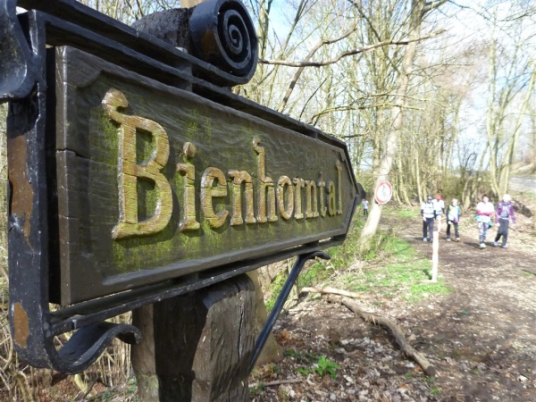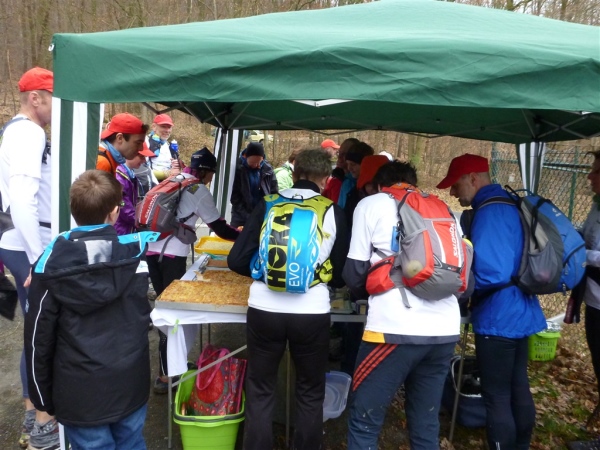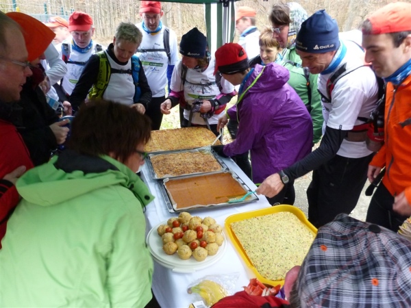 Linksrheinisch geht es zur Pfaffendorfer Brücke, wir streifen das Weindorf, das 1925 zur „Reichsausstellung Deutscher Wein“ eröffnet wurde und den Krieg erstaunlicherweise überlebt hat. Über die Brücke wechseln wir die Seite und ziehen über den Leinpfad, auf dem früher Pferde die Schiffe rheinaufwärts zogen, in den Koblenzer Stadtteil Pfaffendorf. Wir verlassen den Rhein, steigen ins Bienhorntal auf und bekommen so einen ersten Geschmack von den heutigen schönen Trailabschnitten. Bei der Überquerung der Zufahrtsstraße zur Schmittenhöhe, dem ehemaligen Standortübungsplatz (wie oft bin ich hier mit dem Panzer hochgedonnert!) beglücken uns die Bad Emser Lauffreunde mit einer üppigen Verpflegungsstelle. Aufgrund der vorjährigen Erfahrung hatte ich schon befürchtet, daß es auch diesmal wieder keine negative Kalorienbilanz geben wird. Frischer Kaffee, verschiedene Kuchen, ach, ich könnte mich nur so durchfressen! Rolf rettet mich vor dem weiteren Ausbau des Bauchumfangs durch den Befehl zum Abmarsch.