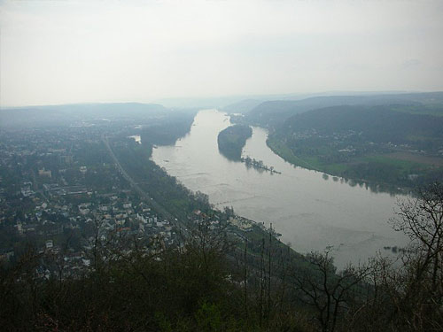 Nach jeder Menge Auf und Ab über prima Waldwege kommen wir oberhalb Dollendorfs heraus und genießen einen schönen Blick über die Wingerte (Weinberge) des nördlichsten rheinischen Weinorts. Weiter hinauf führt uns der Weg durch ein kleines Tor im Zaun auf den Petersberg mit seinem Steigenberger Hotel. Von der Terrassenseite aus hat man einen unvergleichlichen Blick auf Bonn, auch wenn es augenblicklich etwas trüb ist. Im Davoneilen bemerken wir ein Modefototeam und vergleichen, nicht ohne Spott, die hochhackigen Schuhe eines Models mit unseren zarten Laufschuhen. Vermutlich duften wir auch bereits leicht unterschiedlich.