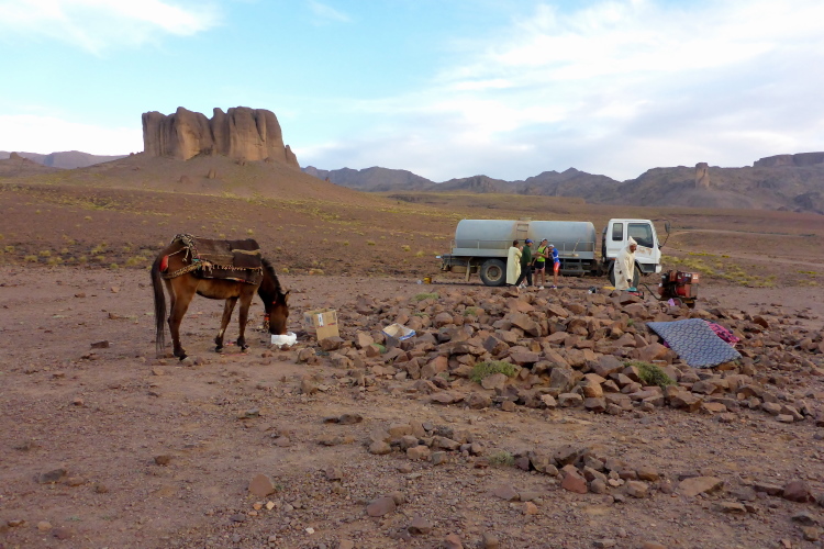 Mustafa kommt mit dem Pickup angedüst: Essensausgabe! Gekocht wurde irgendwo in einem Dorf, wir sind bestimmt 60 Personen, die versorgt werden müssen. Heute Abend gibt’s vegetarisch, die hiesigen Gemüsesorten sind ein wahres Geschmackserlebnis. Mustafa veranstaltet eigentlich Raftingtouren im Hohen Atlas. Die Saison beginnt wieder in wenigen Wochen und dauert bis in den Mai.