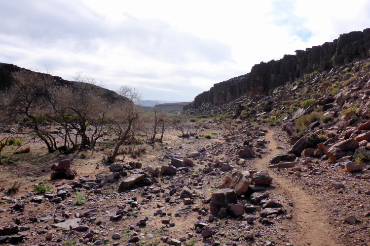 Als es gaaanz tief in das nächste Tal geht, mache ich keine Fotos, die Lumix ist zwischen meinen Zähnen, die Hände sind in die Felslücken gekrallt. Skorpione, die gibt es hier, die großen schwarzen und die kleinen weißen. Egal ob schwarz oder weiß, wird man gestochen, muss man ins Krankenhaus und den Rückflug verschieben. Schlangen und Spinnen zeigen sich erst im Hochsommer, wenn wir in Europa laufen.