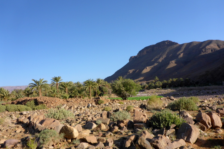 Die ersten Kilometer führen uns von der Herberge in Bassou unterhalb der Pitons du Sagrho durch das grobsandige Flussbett des Taoudacht. Das Wasser ist flach, verzeiht Trittfehler. Die salzweißen Steine geben guten Gripp. Leider hole ich Zineb ein, und die versucht mir ein morgendliches Gespräch aufzudrücken. Zu uns gesellt sich noch das Besenmaultier, das auch nicht den Mund halten will. Ich versuche abzudampfen.