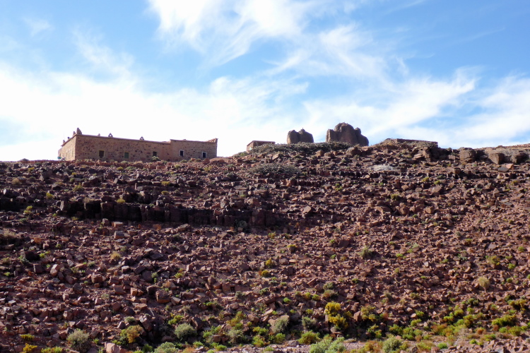 Ich hatte meine warme Jacke im November bei Lahcen in der Wohnung vergessen. Ohne diese Jacke wäre ich heute Nacht (1700 m) erfroren. Ein Rumpeln, ein tierischer Fluch: Uwe ist über eine der zahlreichen Steinpyramiden gefallen. Ich bin noch nicht wach, da laufen mir schon die Tränen runter. Dann noch seine Versuche, die Pyramide zu reparieren. Hahahaha.