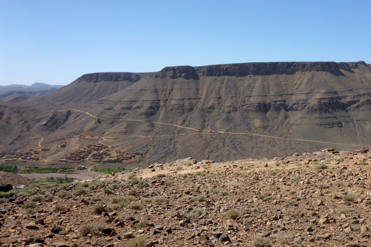 Im Tal angekommen, geht es schon Richtung N´Kob. Eine normale Schotterstraße, links und rechts unter Folie zeigen sich die Keime der Wassermelonen. In wenigen Wochen rumpeln wieder 500 Laster täglich über den Hohen Atlas, um Melonen aus der Sahara nach Europa zu bringen. Die Erbsenpflanzen sind jetzt 1,5 Meter hoch, die Schoten prall gefüllt, so wie die Kipper, die riesigen Lastwagen. Hier kommt der Kobaltflöz von Tiouit an. Der Kipper ist aus Australien, rechtsgesteuert, der Fahrer beugt sich raus und meint, ich sei verrückt. Dafür kann ich laufen, noch nicht perfekt, es wird aber wieder.