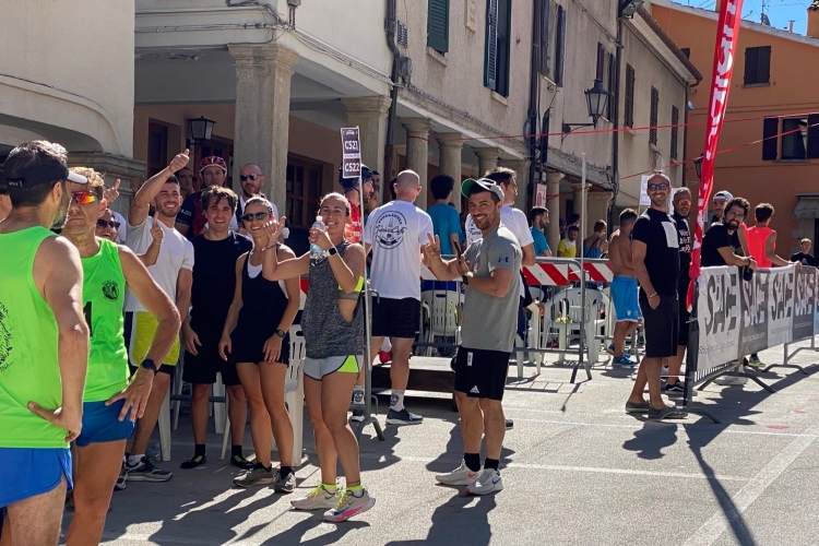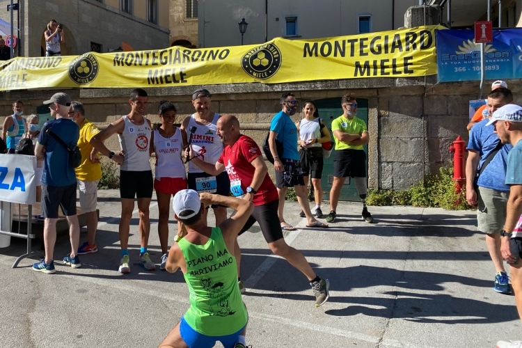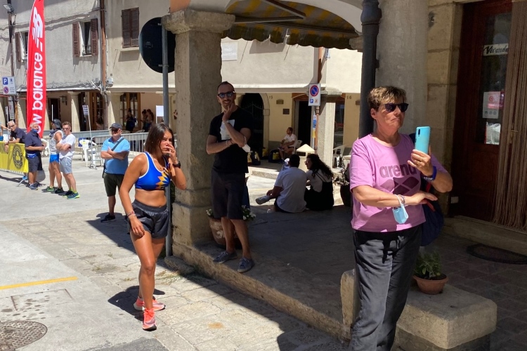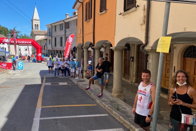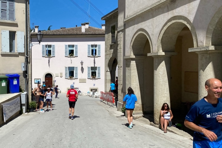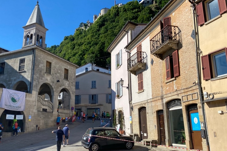 Kilometer fünf markiert wieder den oberen Teil der Welle, dann geht es bergab, an einem Fußballfeld vorbei. Kurz vor dem Ziel kommen wir nach Borgo Maggiore und sehen uns mit einer Schikane konfrontiert: In einem Gässchen geht es sehr steil etwa 20 Höhenmeter nach oben. Aber auch die sind zu schaffen. Der Zielbogen erwartet uns kurz danach. Ein Verantwortlicher schreit mich an, dass ich mit meiner Kamera die Startnummer verdecke. Auch hier wird anscheinend wie an mehreren Stellen die Startnummer aufgeschrieben, dann über die Zeitmessmatte. Die wartenden Staffelteilnehmer feuern uns an. Auch ein paar Zuschauer, ansonsten dünn gesät, haben sich hier eingefunden. Spaziergänger sehen wir zwar hin und wieder an der Strecke, aber die nehmen uns Sportler nicht zur Kenntnis. Sammarinesi sind wohl nicht so sportbegeistert.