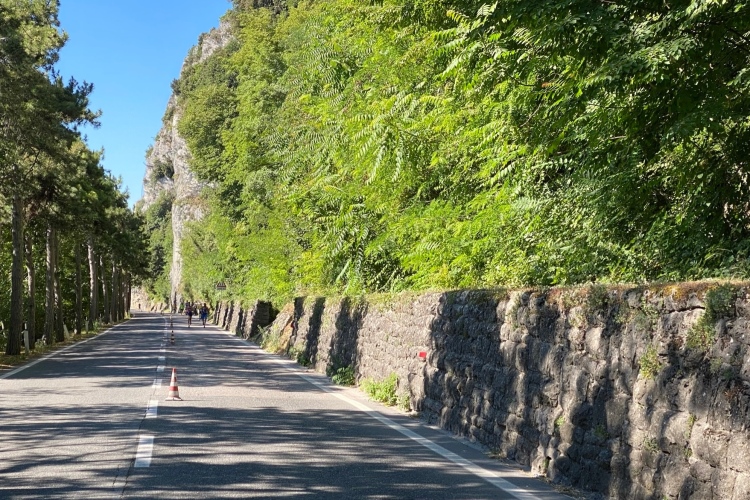Besonders die Panoramica ist mörderisch. Hier gibt es nur noch pralle Sonne. Gelegentlich ist es windstill und ich habe das Gefühl, keine Luft mehr zu bekommen. Aber meist folgt bald wieder ein kühler Bergwind. Mir fehlt auch eine Sonnenbrille. Ich laufe fast immer ohne, aber nun habe ich Probleme mit dem hellen Asphalt. Wieder was für den nächsten Sommerlauf gelernt: Sonnenbrille mitnehmen.