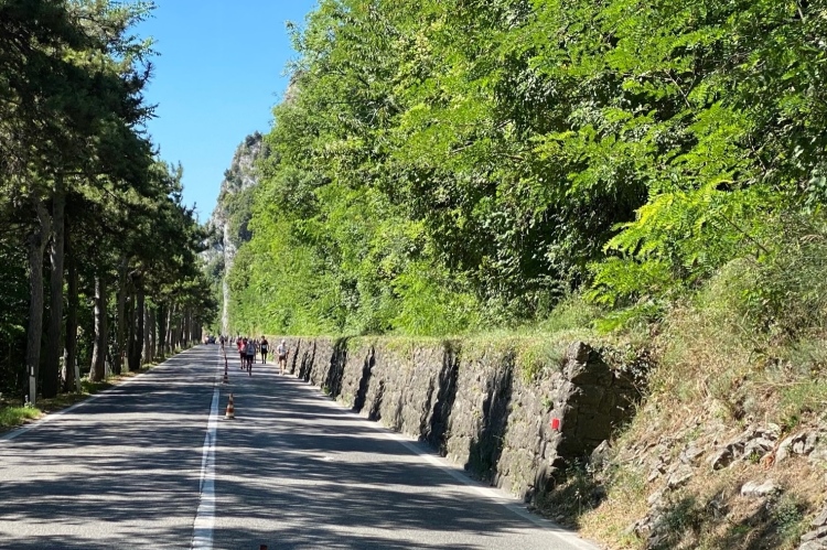 Wir rasen nun auf der Panoramica bergab. Kilometer vier unter einem Felsenturm, oben die erste Festungsanlage von San Marino. Nach dieser Kuhle geht es jetzt einen Kilometer schnurgerade nach oben. Rechts können die Autos fahren. Aber es sind nicht viele und sie sind recht langsam unterwegs. Die ganze Strecke ist perfekt gesichert. Der Anstieg ist ganz gut zu laufen, zieht sich aber doch beträchtlich hin. Schön, mal wieder ein Läuferfeld vor und hinter sich zu haben.