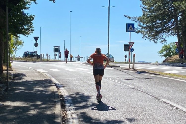 Dann kommt Judith als Führende einer größeren Gruppe ins Ziel. Das ist doch mal was, zumal darunter auch viele Läuferinnen vom Club Supermarathon Italia sind. Im Auto wartet Eigenverpflegung auf uns. Als wir nach einer halben Stunde die Rückfahrt antreten, laufen immer noch Marathonis auf ihrer hoffentlich letzten Runde an uns vorbei.