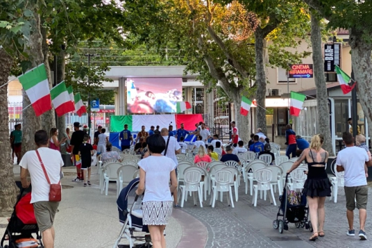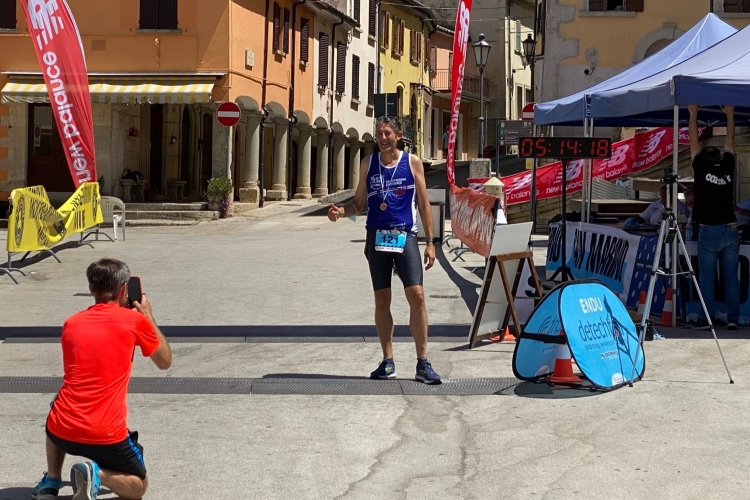 Ich gehe noch mal zum Verpflegungsstand. Viel ist nicht mehr da, da möchte ich den Folgenden nichts wegessen. Die Sonne auf der Piazza Maggiore brennt fürchterlich. Ich suche ein Schattenplätzchen mit Blick auf den Zieleinlauf. Im Minutentakt kommen Sportler ins Ziel. Viele haben aber noch eine weitere Runde vor sich. Einige reißen glücklich die Arme hoch.