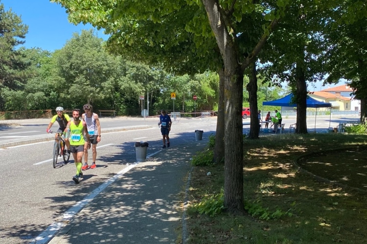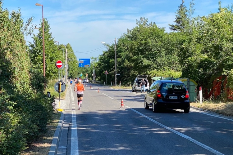 Nun werden wir oft von Staffelläufern überholt. Die nehmen das sehr ernst und sind auch sehr knapp bekleidet, was besonders bei den Läuferinnen auffällt. Ich habe ein Hemd mit Ärmeln an, um mich vor der Sonne zu schützen, und ein Halstuch, welches ich auch als Maske verwenden könnte. Ich halte mein Tempo und setze mich von Judith ab. Theoretisch hätte ich auf diesem Kurs die Möglichkeit, sie zu überholen. Diese Idee erscheint allerdings etwas gewagt. Mal abwarten.