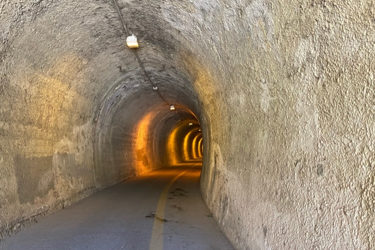 Ich bin gespannt, was uns auf der 6,0325-km-Runde so erwartet. Und natürlich auf die Verteilung der Höhenmeter. Es geht erst mal steil bergab, um die Seilbahnstation herum, die nach San Marino hinauf führt. Nach zwei Spitzkehren befinden wir uns in einem Eisenbahntunnel. Die Schmalspurbahn verband bis 1944 den Bahnhof Rimini mit San Marino. Im Krieg flüchtete man hier vor den Bomben in die Tunnel, einige Fotos erinnern daran. Obwohl San Marino neutral war und die Grenze mit großen weißen X markiert hatte, wurde es aufgrund eines Missverständnisses von den Briten bombardiert. Danach waren Teile der Bahnanlagen zerstört und die Bahn wurde auch nie mehr aufgebaut. Man liest, dass eine Reaktivierung im Gespräch ist. Für Touristen sicher eine wunderschöne Sache. Und Pendler könnten sich die vielen Ampeln sparen.