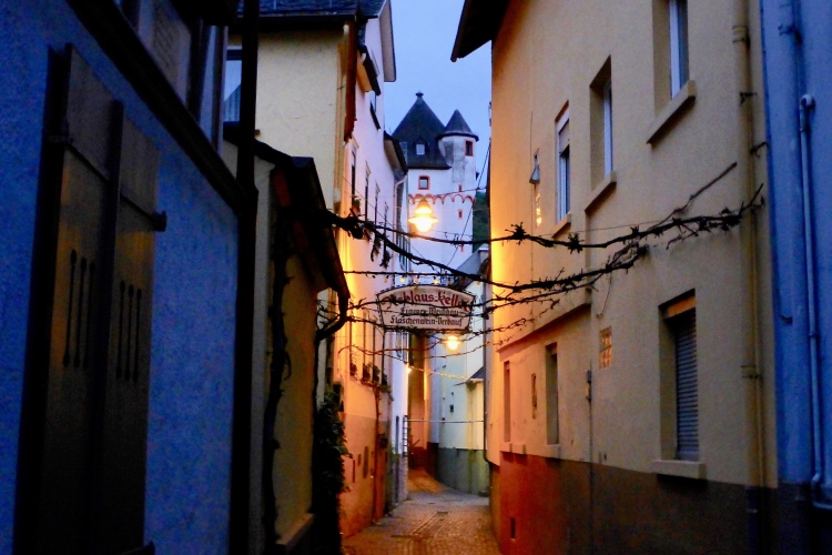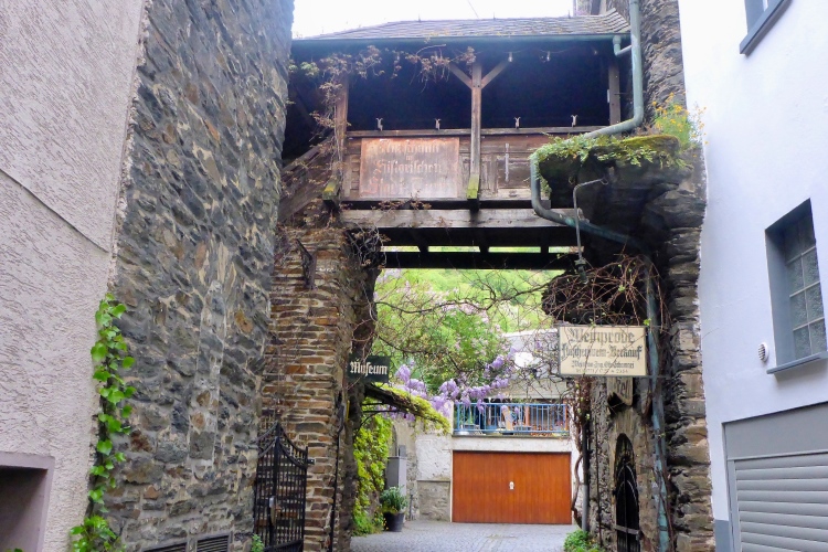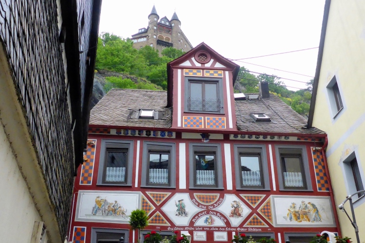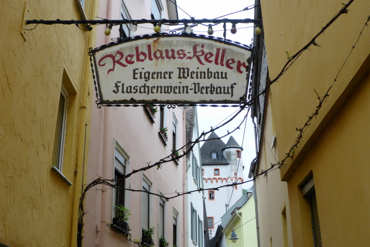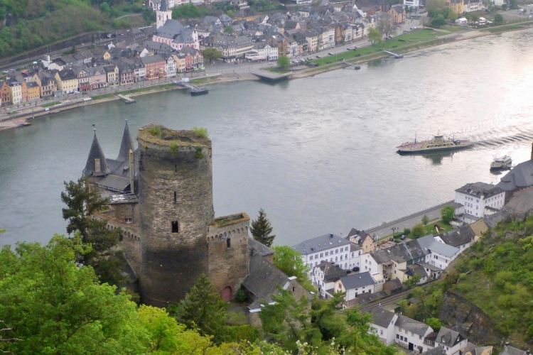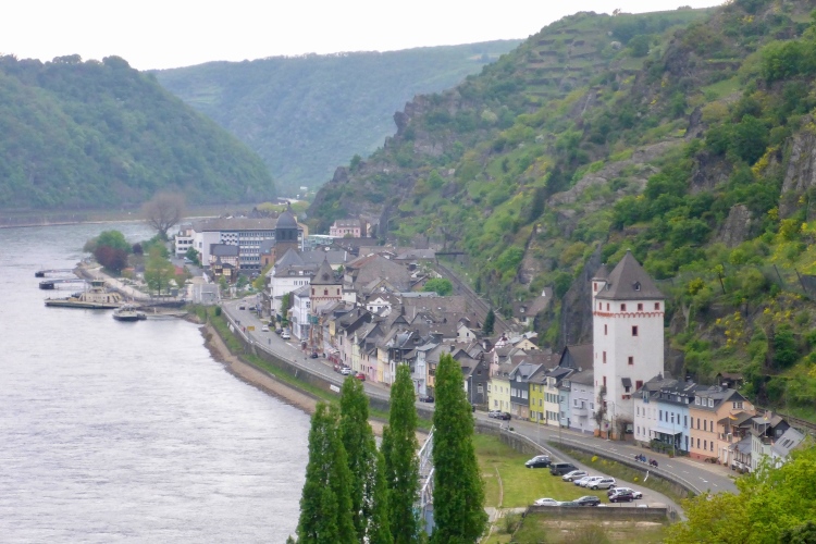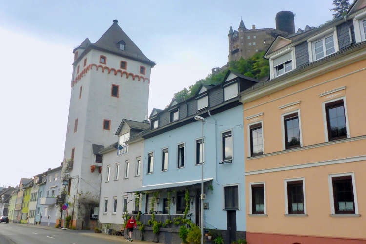 St. Goarshausen wurde 1222 erstmals urkundlich erwähnt. Schon Anfang des 14. Jahrhunderts wurde hier Weinbau dokumentiert, bereits damals auch der heute für das Rheintal typische Riesling. Im 30jährigen Krieg waren St. Goarshausen und das gegenüberliegende St. Goar stark umkämpft und zeitweise belagert. Im Hessenkrieg 1644-48 wurden die Städte erneut belagert. Am Ende der kleinen Fußgängerzone laufen wir am Eckigen Turm vorbei, der einst Wehrturm und Zollstation für die Rheinschiffer war und heute als Wein- und Stadtmuseum dient.