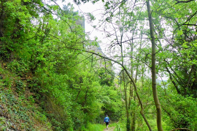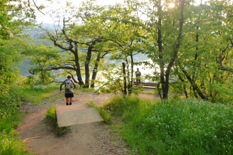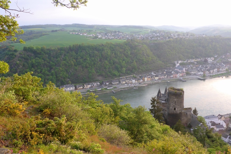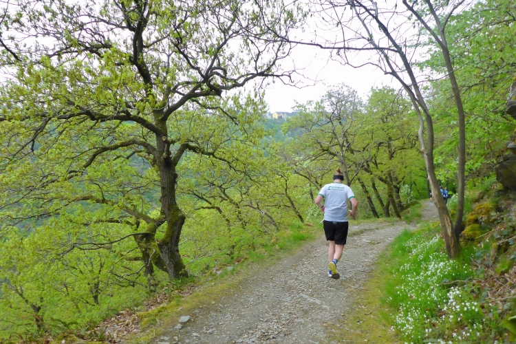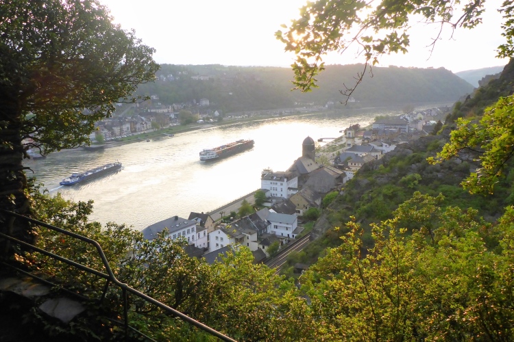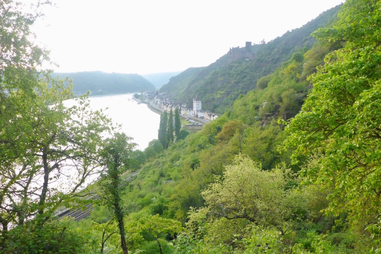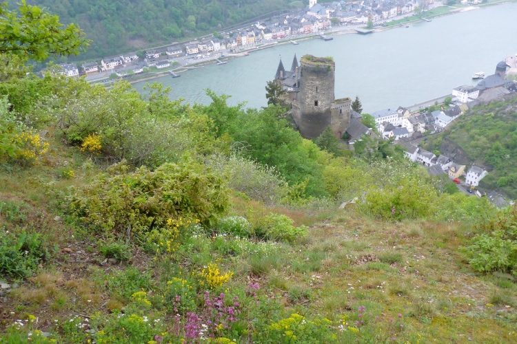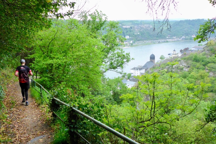 Gleich nach dem Start kommen wir an zwei Aussichtspunkten mit herrlichem Blick zur Burg Katz und nach St. Goarshausen und St. Goar vorbei. Dann laufen wir schnell durch wunderschönen Wald bergab. Die erste Hälfte der Abstiegsstrecke kann man einigermaßen gut laufen, danach folgen immer wieder teilweise steile Treppen. Neben dem Weg blühen viele Blumen, Sträucher und Bäume. Obwohl wir an der um 1371 erbauten Burg Katz (eigentlich Burg Neu-Katzenelnbogen) vorbeilaufen, sieht man von dem Gemäuer an diesem Streckenabschnitt nur wenig. Die Burg ist in Privatbesitz und kann nicht besichtigt werden.