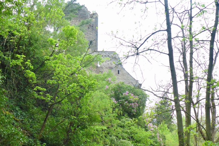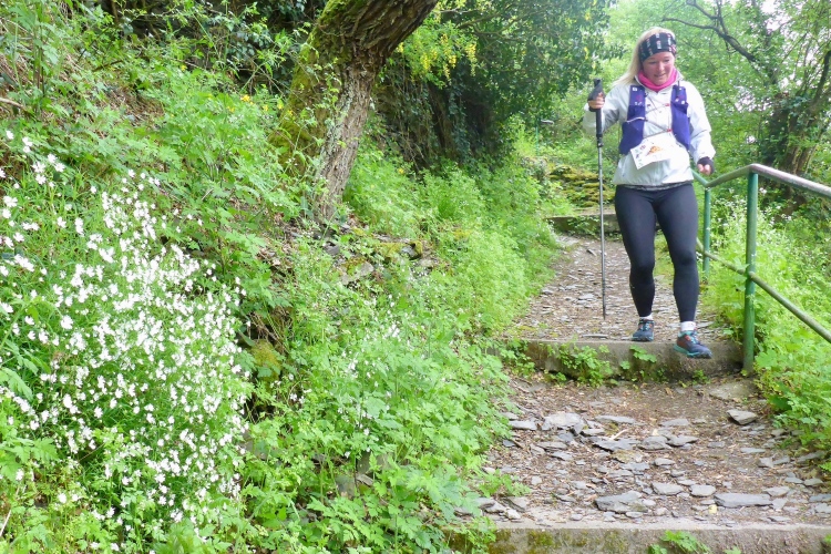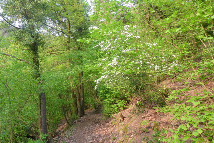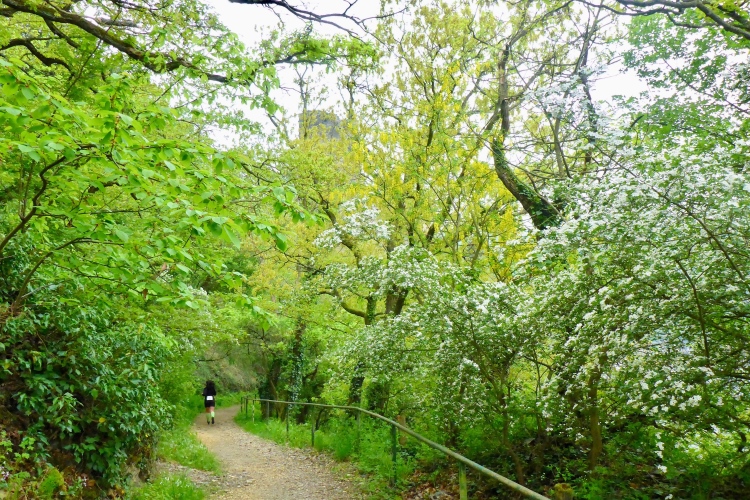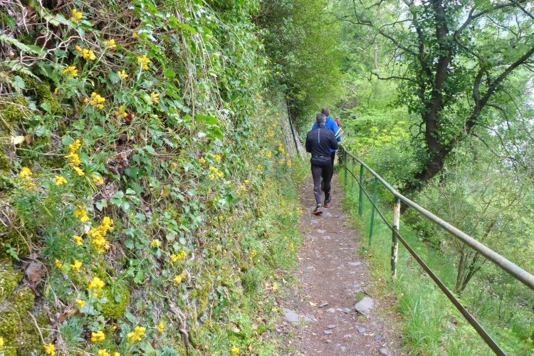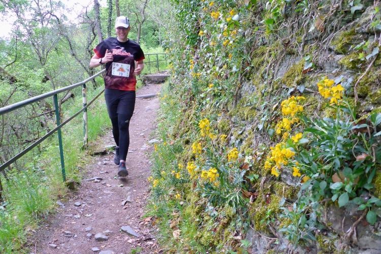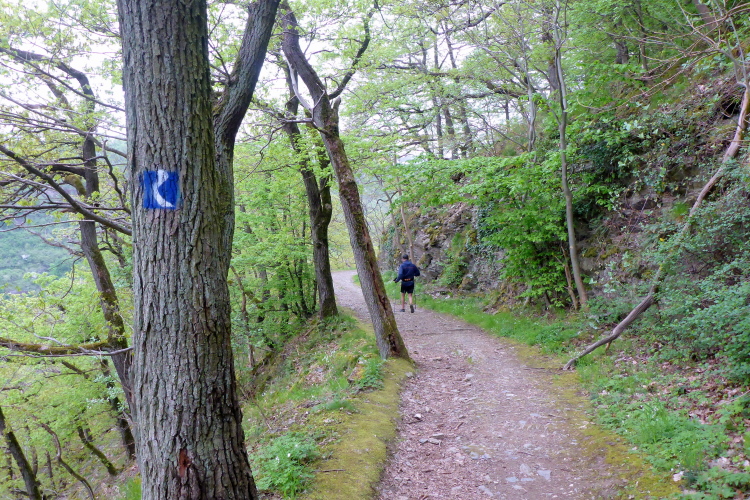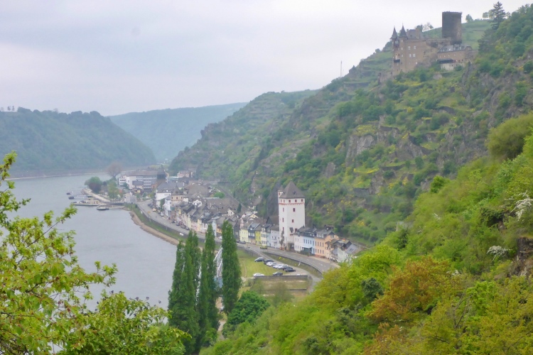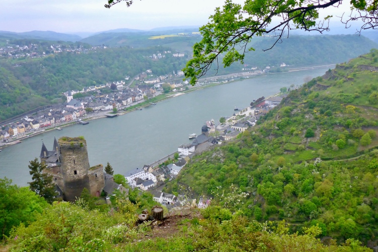 Gleich nach dem Start kommen wir an zwei Aussichtspunkten mit herrlichem Blick zur Burg Katz und nach St. Goarshausen und St. Goar vorbei. Dann laufen wir schnell durch wunderschönen Wald bergab. Die erste Hälfte der Abstiegsstrecke kann man einigermaßen gut laufen, danach folgen immer wieder teilweise steile Treppen. Neben dem Weg blühen viele Blumen, Sträucher und Bäume. Obwohl wir an der um 1371 erbauten Burg Katz (eigentlich Burg Neu-Katzenelnbogen) vorbeilaufen, sieht man von dem Gemäuer an diesem Streckenabschnitt nur wenig. Die Burg ist in Privatbesitz und kann nicht besichtigt werden.