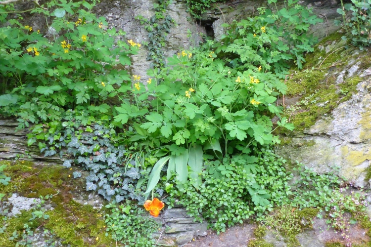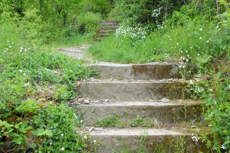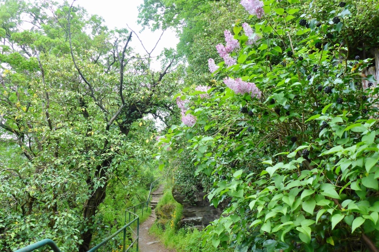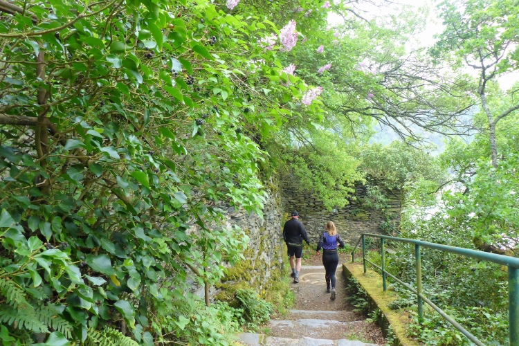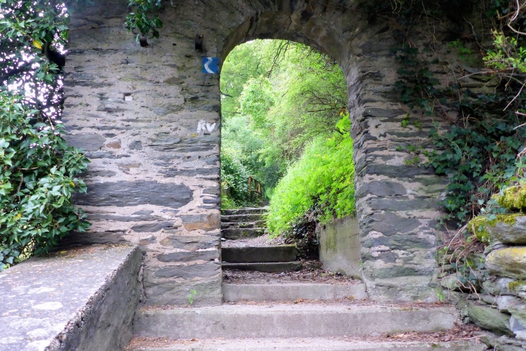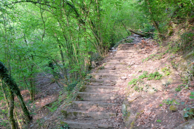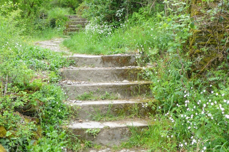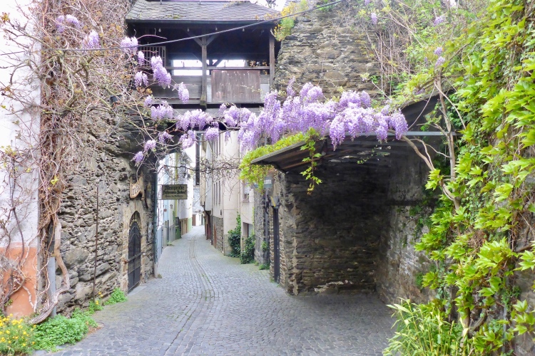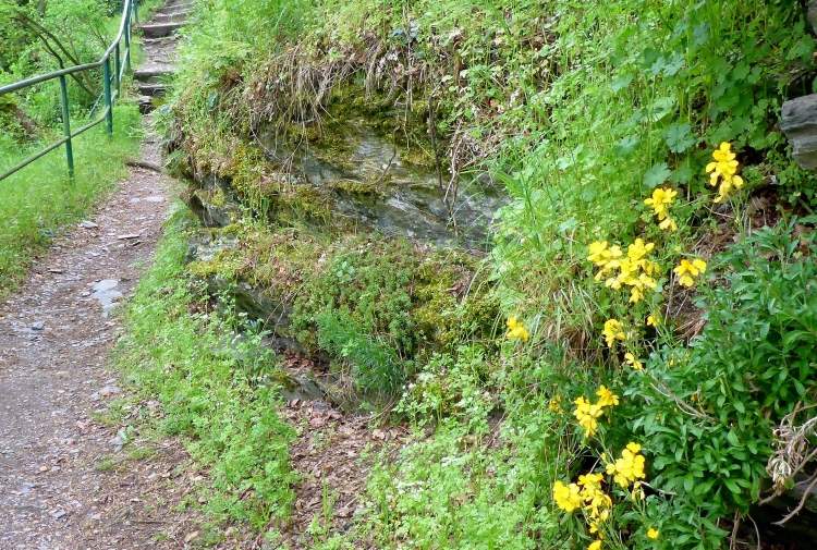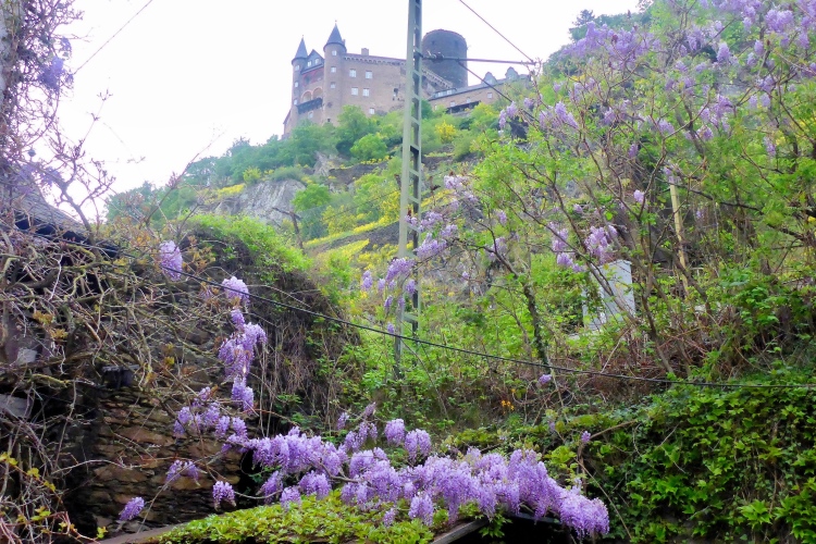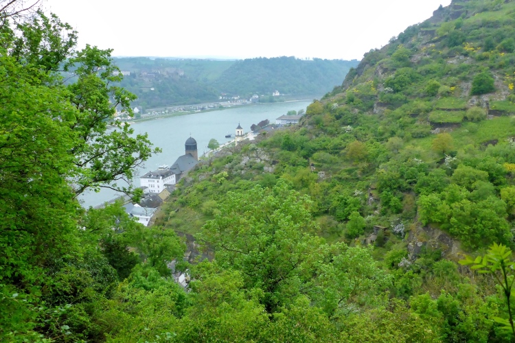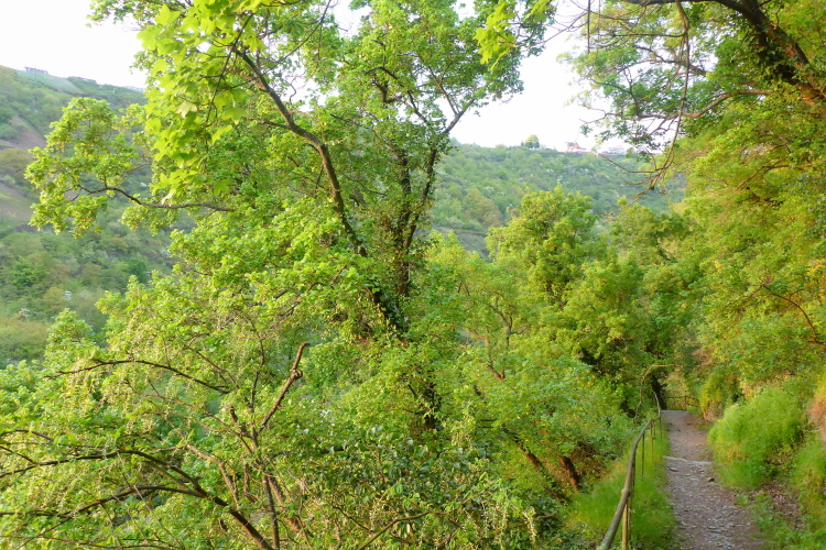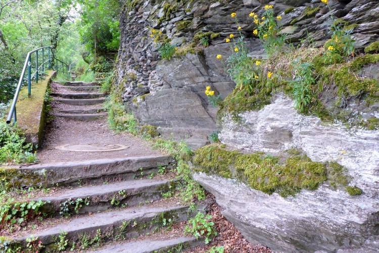 Durch eine schmale Unterführung passieren wir die Bahnstrecke. Schon beginnt der Aufstieg. Auch hier wechselt die Strecke oft zwischen einigermaßen moderat und steilen Treppen. Im unteren Abschnitt begeistern mich die Aussicht auf den Rhein und St. Goarshausen sowie die Vegetation und die alten Steinmauern. Früher wurde auch hier Wein angebaut, aber inzwischen holt sich die Natur ihr Revier zurück.