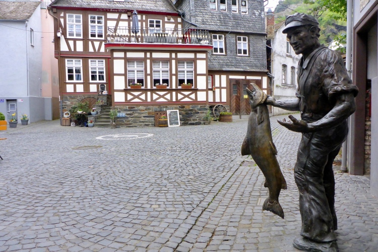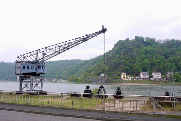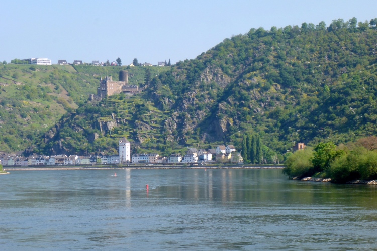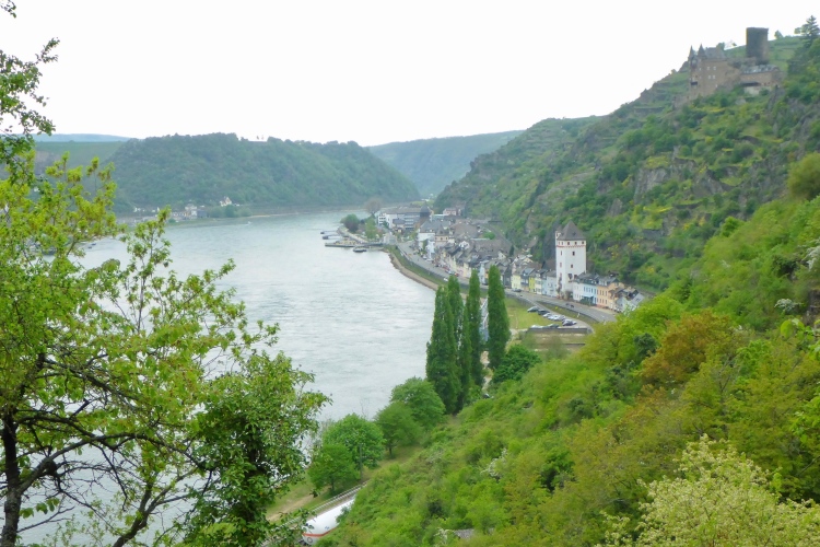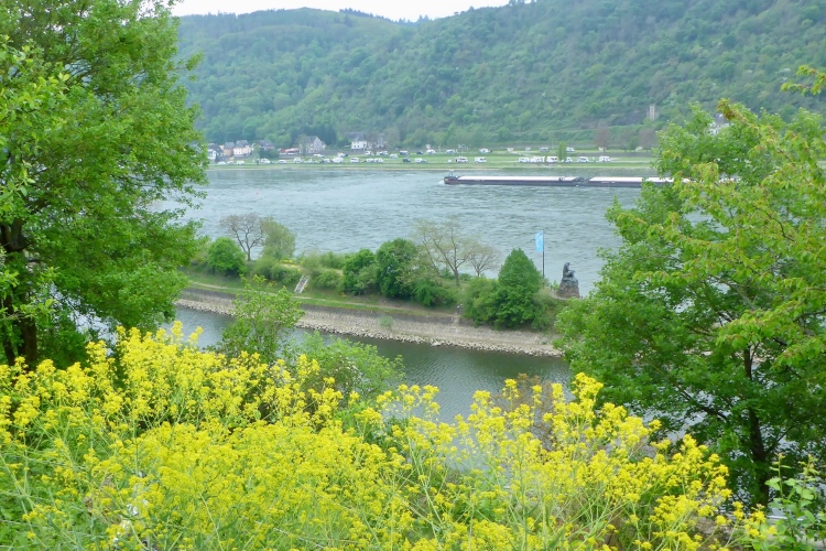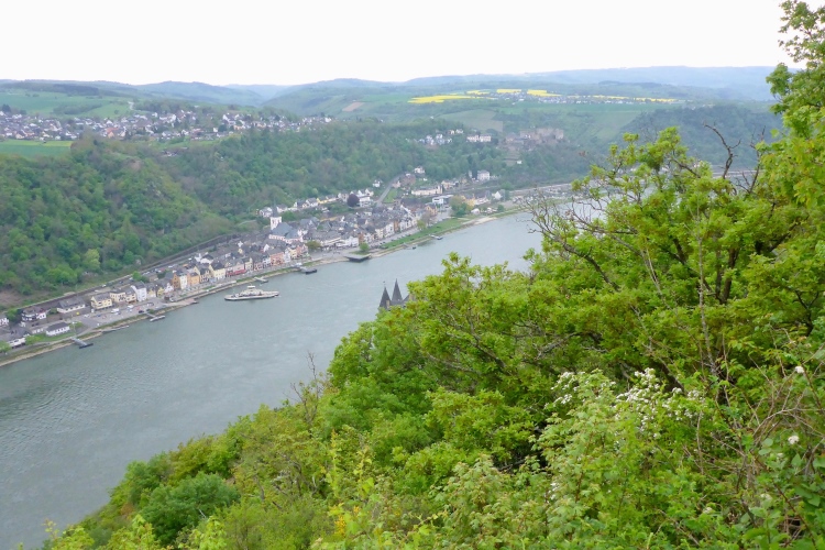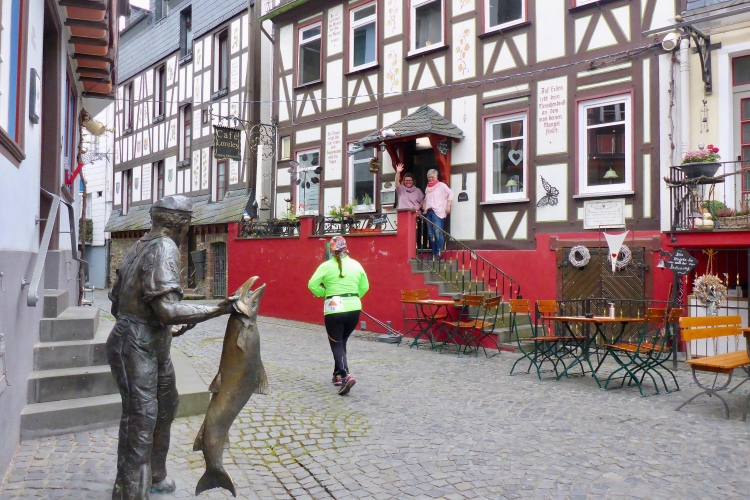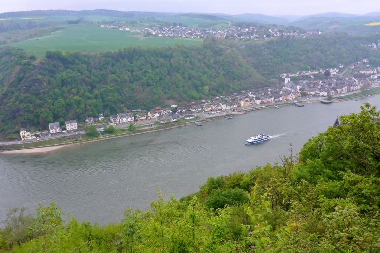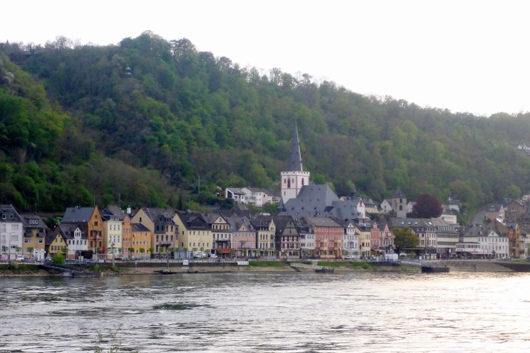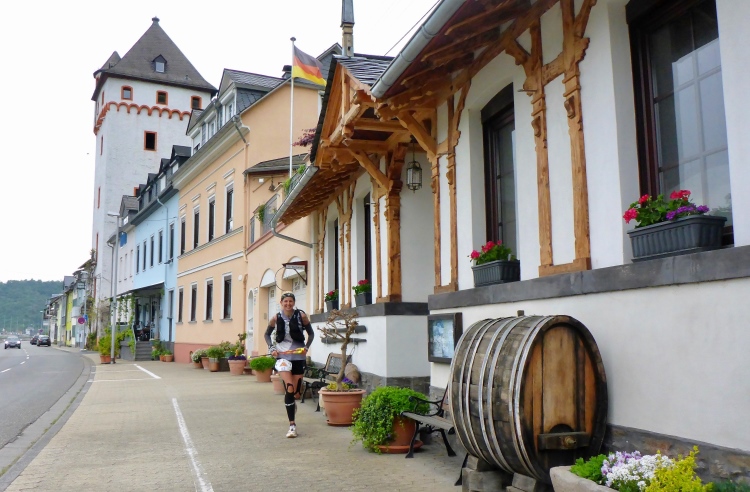 Am Marktplatz von St. Goarshausen wird die Zwischenzeit gemessen. Kurz laufen wir durch die sehr ruhige Fußgängerzone, dann etwa 300 m neben der Bundesstraße am Rhein entlang.