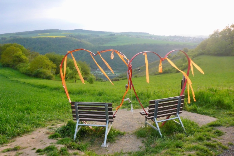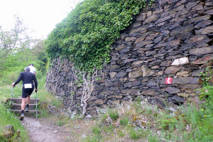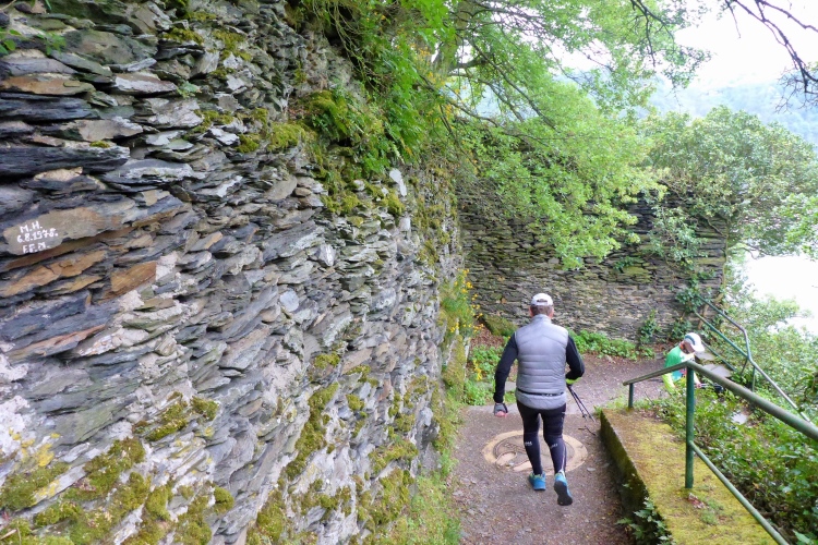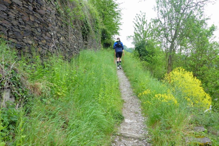 Da die Hälfte unserer Strecke auf dem Rheinsteig führt, einem der beliebtesten Fernwanderwege Europas, treffen wir natürlich auch einige Etappenwanderer. Bei meinem 10.000 km Deutschland-Wanderer Projekt war ich hier im Rekordsommer 2019 unterwegs. 41 Grad auf schattenlosen Weinbergen - da ist mir das kühle Wetter heute deutlich lieber. Zum Glück bleibt der angekündigte Regen aus, denn die Schiefersteine am Boden werden bei Nässe recht rutschig.