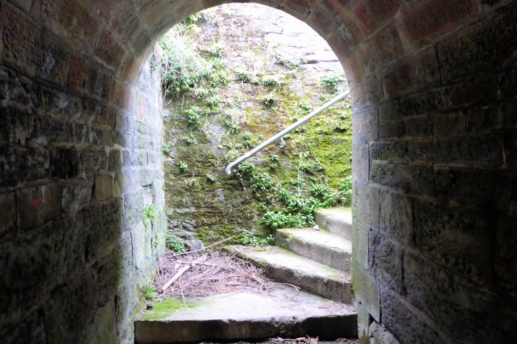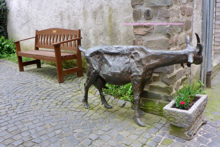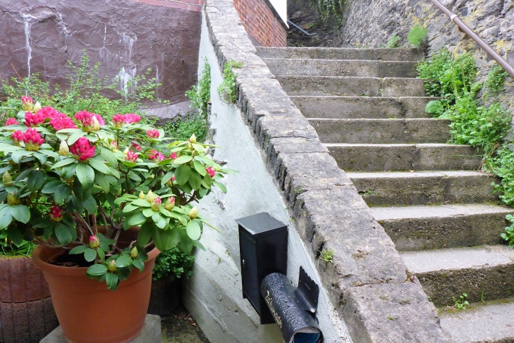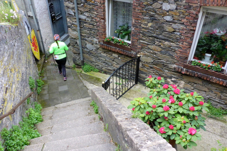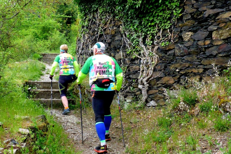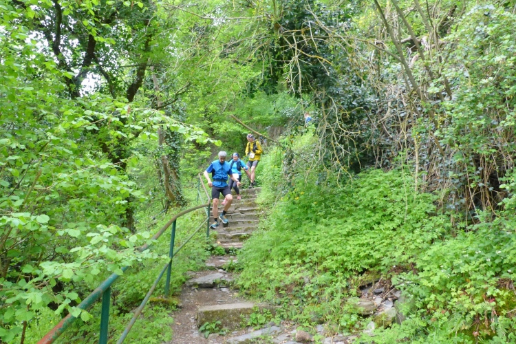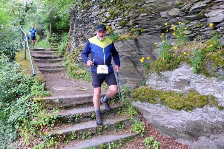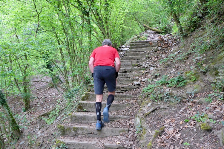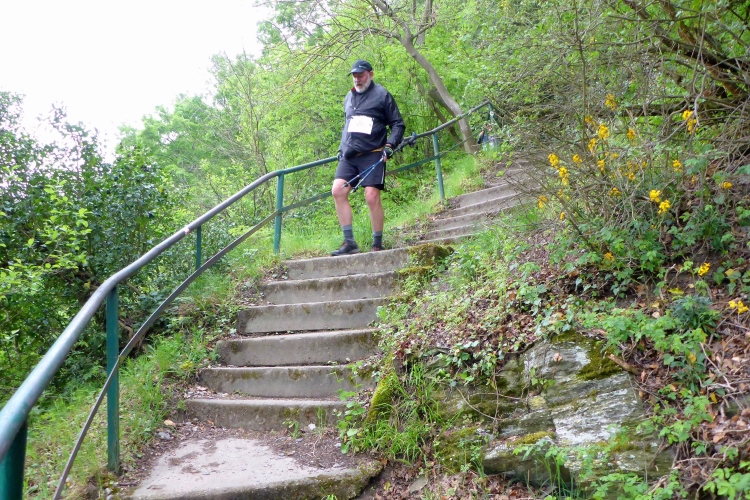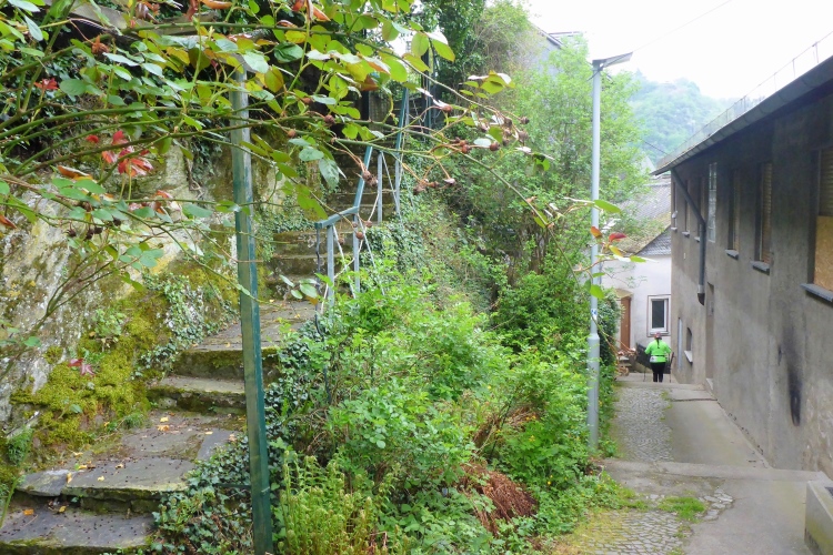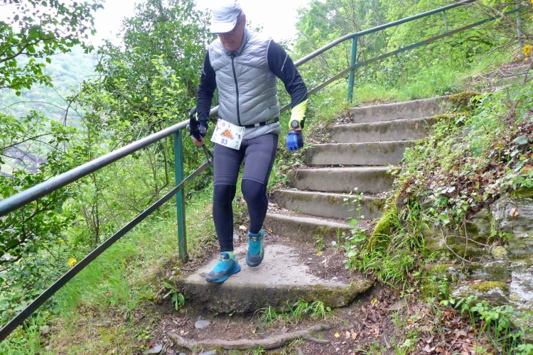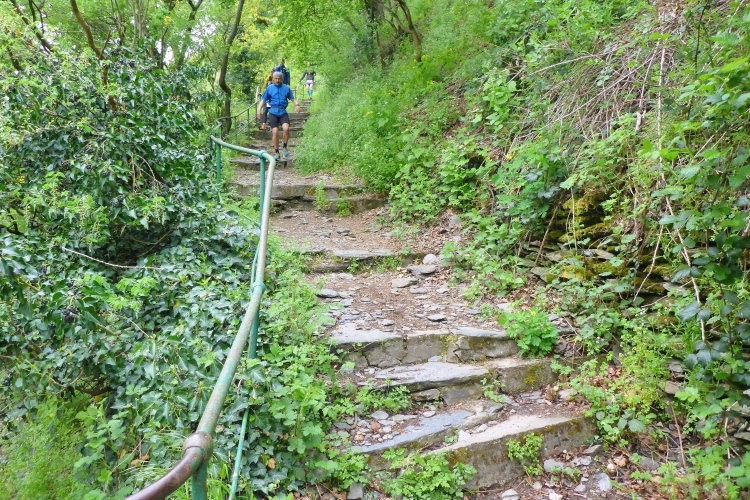 Die Höhenmeter verteilen sich nicht gleichmäßig auf die gesamte Strecke. Beim Abstieg geht es auf 1,3 km 170 Höhenmeter bergab, beim Aufstieg mühen wir uns auf 850 m 175 Höhenmeter bergauf, dazwischen bieten der völlig flache Abschnitt unten am Rhein und der fast ebene Teil im Ortsteil Heide Gelegenheit für schnelleres Tempo. Obwohl nur wenige Prozent der Gesamtstrecke über Treppen führen, prägen diese den sportlichen Charakter. Gut, dass ich in den letzten Wochen Treppensteigen geübt habe.