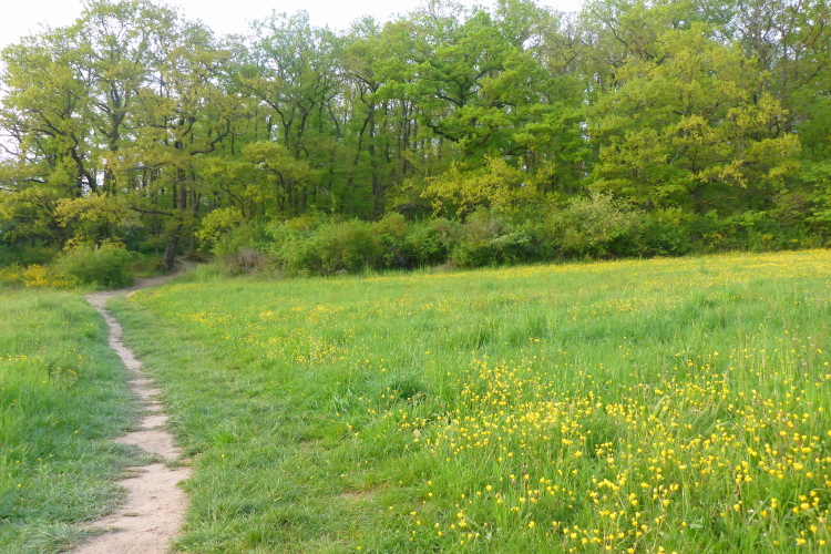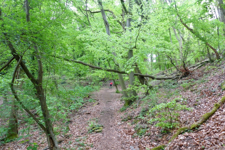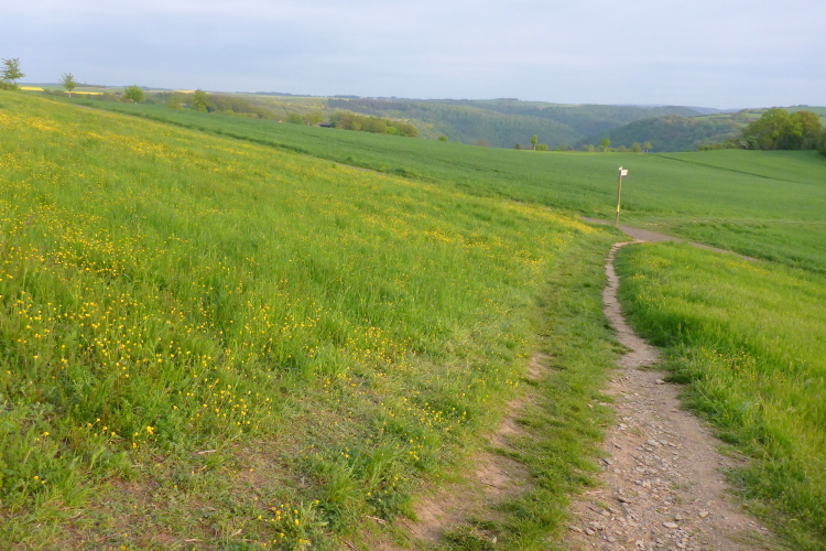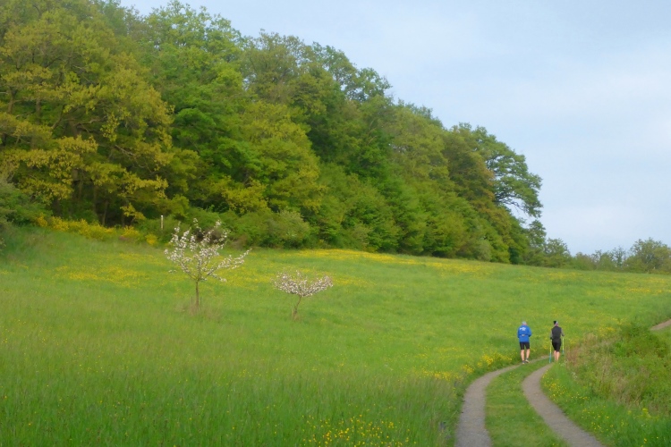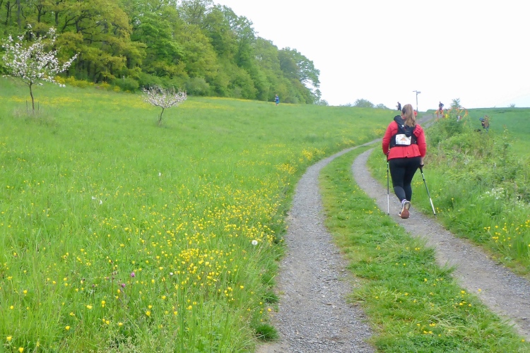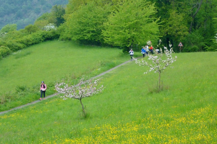 Dann steigen wir wieder durch lichten Wald bergauf. Hier belohnt uns intensives Vogelgezwitscher für unsere Anstrengung. Kurze Zeit laufen wir über blühende Wiesen, dann noch einmal kurz durch den Wald. Im Ortsteil Heide können wir eine Weile mit minimalem Gefälle etwas schneller laufen oder uns vom Aufstieg erholen. Als ich nach meiner ersten Runde wieder am Start-Ziel-Bereich ankomme, ist der Bürgermeister noch immer da und plaudert mit Läufern. Man merkt, dass dies nicht nur ein PR-Besuch von ihm ist, sondern echtes Interesse dahintersteckt.