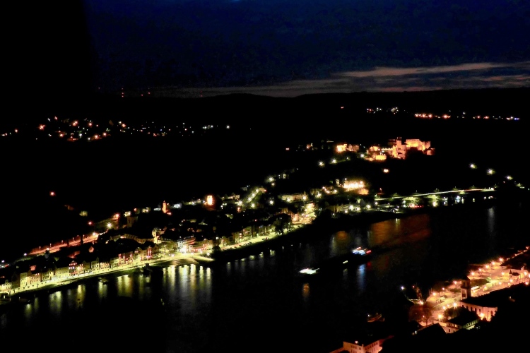 Am Freitag fotografiere ich vom Dreiburgenblick die Aussicht hinüber zur Laufstrecke. Bild 1 zeigt ganz links oben die Scheinwerfer am Sportplatz, wo wir starten, ganz rechts unten ist St. Goarshausen.