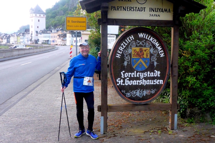 Wenige Minuten vor dem Start erzählt uns Veranstalter Alex Holl etwas über die Strecke. Dann begrüßt uns auch der Bürgermeister von St. Goarshausen. Pünktlich um 10 Uhr geht es dann los. Ich lasse allen, die es eilig haben, genug Vorsprung. Viele von ihnen werde ich irgendwann einholen und überrunden.